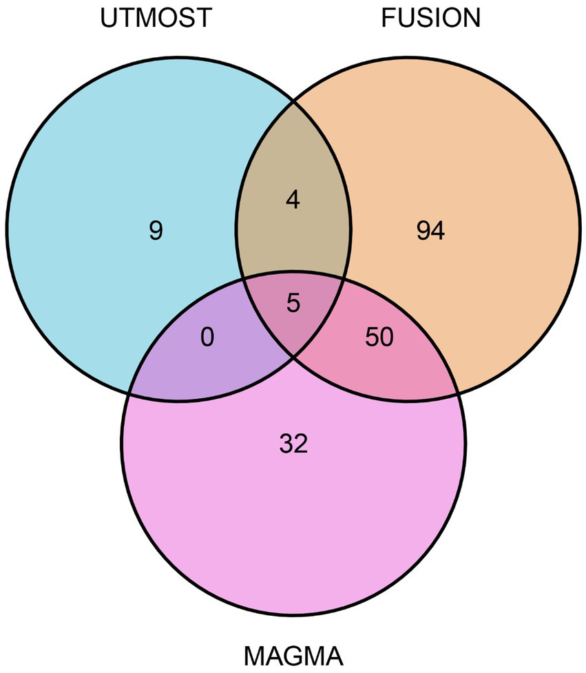 Venn diagram. MAGMA identified 87 significant genes associated with glioma, FUSION identified 153, and UTMOST cross-tissue analysis identified 18.