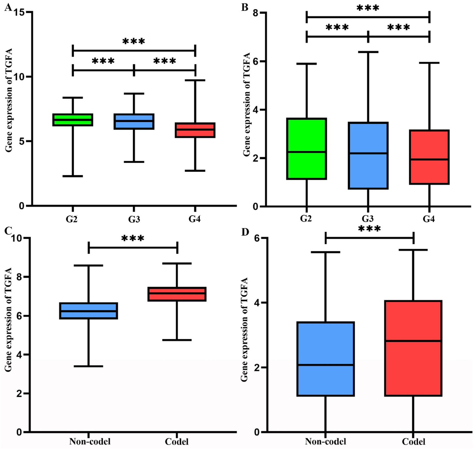 Analysis of TGFA gene expression and genetic alterations in TCGA and CGGA. (A) Gene expression levels of TGFA across distinct grades in TCGA. Statistical significance was determined by ANOVA (p < 0.001). (B) Gene expression levels of TGFA across distinct grades in CGGA. Statistical significance was determined by ANOVA (p < 0.001). (C) Association between TGFA expression and 1p/19q chromosomal deletion status in TCGA (Non-deletion vs. Co-deletion). Statistical significance was determined by ANOVA (p < 0.001). (D) Association between TGFA expression and 1p/19q chromosomal deletion status in CGGA (Non-deletion vs. Co-deletion). Statistical significance was determined by ANOVA (p < 0.001).