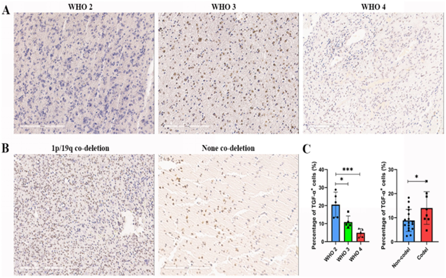Association between TGFA immunoexpression and clinicopathological features in glioma cases. (A) Representative images of IHC staining of TGFA index in glioma samples across distinct grades. (B) Representative images of IHC staining of TGFA index in glioma samples across 1p/19q chromosomal deletion status. (C) Results of the percentage of TGF-α+ cells of TGFA in distinct grades and 1p/19q chromosomal deletion status. *p < 0.05; **p < 0.01; ***p < 0.001.