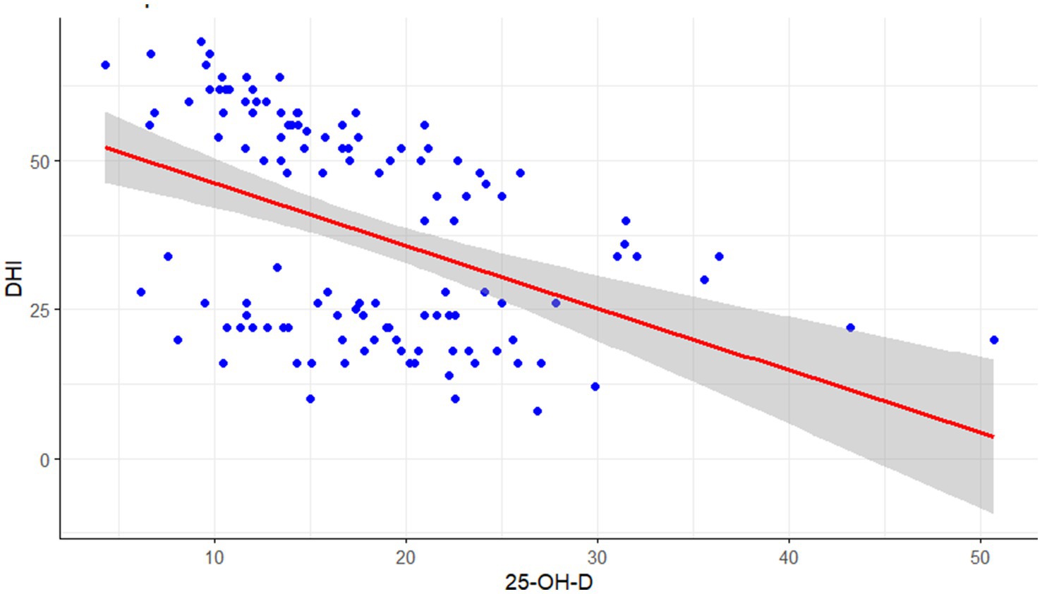 The direct relationship between 25-OH-D levels and DHI scores was then examined. As illustrated in the scatterplot in Figure 1, a Spearman rank correlation analysis revealed a statistically significant, moderate negative correlation between the two variables (r = −0.44, p < 0.001), indicating that higher vitamin D levels are associated with lower dizziness-related handicap.