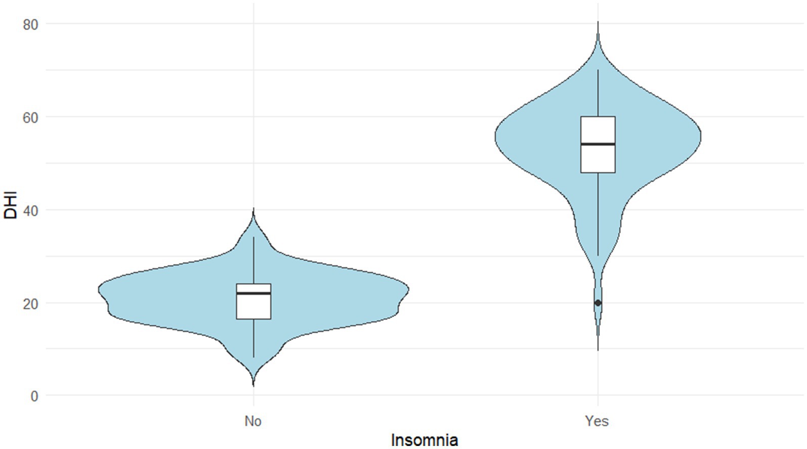 To assess the impact of insomnia, DHI scores were compared between patients with and without insomnia. A Mann–Whitney U test revealed that the DHI scores were significantly higher in the insomnia group compared to the non-insomnia group (p < 0.05). The violin plot in Figure 2 visually illustrates this difference in score distribution between the two groups.