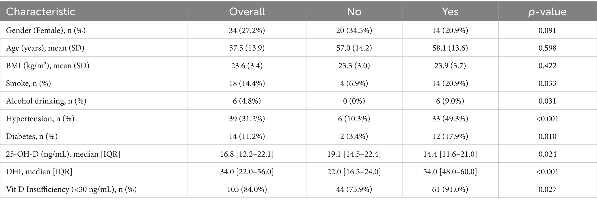 A comparison of baseline data revealed no statistically significant differences between the two groups in terms of age, BMI, or gender distribution (all p > 0.05). However, significant differences were observed in lifestyle factors, comorbidities, and serum 25-OH-D levels. Specifically, the insomnia group had a significantly higher proportion of smokers (20.9% vs. 6.9%, p = 0.033) and alcohol drinkers (9.0% vs. 0%, p = 0.031) compared to the no-insomnia group.