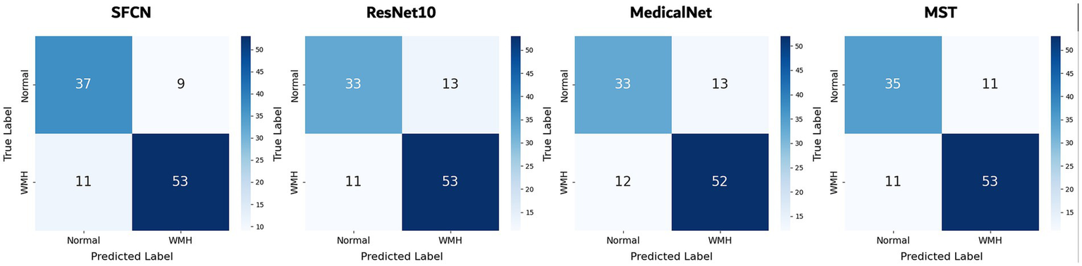 This study involved two classification tasks: (1) binary classification of WMH presence (grade 0 vs. grades 1–3) and (2) three-class classification of WMH severity (grade 0 vs. grade 1 vs. grades 2–3). Grades 2 and 3 were merged due to the limited number of grade 3 samples, to ensure sufficient representation and stable training. This grouping also reflects prior studies both those using retinal images as extracranial surrogates and various clinical studies, in which Fazekas grades 2 and 3 are combined into a single “moderate–severe WMH” category (9–11, 32, 33). The dataset was divided into training, validation, and test sets in an 8:1:1 ratio using stratified sampling based on a combined key of WMH grade and age group, with age binned in 10-year intervals. This ensured balanced class distributions and demographic consistency across the subsets, with all splits performed at the subject level to prevent data leakage. Experiments were repeated with five different random seeds, with each seed producing a new stratified split of the dataset into training, validation, and test sets. Model performance is reported as the mean value with 95% confidence intervals across the five runs, capturing variability due to model initialization and data partitioning. To enhance model generalizability, data augmentation was performed during training, which included random affine transformations with rotations of up to 10°, translations of up to 4 voxels, and horizontal flipping based on a probabilistic strategy. All models were trained using the AdamW optimizer, with the ReduceLROnPlateau scheduler being employed to reduce the learning rate when the validation loss plateaued. The learning rates were tuned manually separately for each model to optimize performance: 1 × 10−5 for ResNet10, 1 × 10−4 for MedicalNet, 5 × 10−4 for SFCN, and 1 × 10−6 (binary) and 5 × 10−7 (three-class) for MST. All models were trained for up to 300 epochs, with early stopping based on the validation loss to prevent overfitting. The batch sizes ranged from 18 to 64, depending on the memory requirements of the models. All models were implemented in PyTorch 2.1.2 with CUDA 12.1 and trained on a single NVIDIA RTX A6000 GPU of 48 GB memory. Final performance was evaluated using standard classification metrics, including accuracy, precision, recall, F1 score, and the area under the receiver operating characteristic curve (AUC). Confusion matrices and ROC curves were generated to provide a detailed view of the class-wise prediction performance.