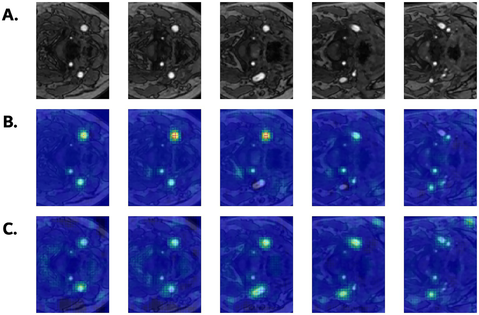 (A) Axial input slices of original TOF MRA from a subject with WMH (grade 2). Corresponding occlusion sensitivity maps from (B) SFCN and (C) MST models. Warmer regions indicate larger drops in predicted WMH probability.