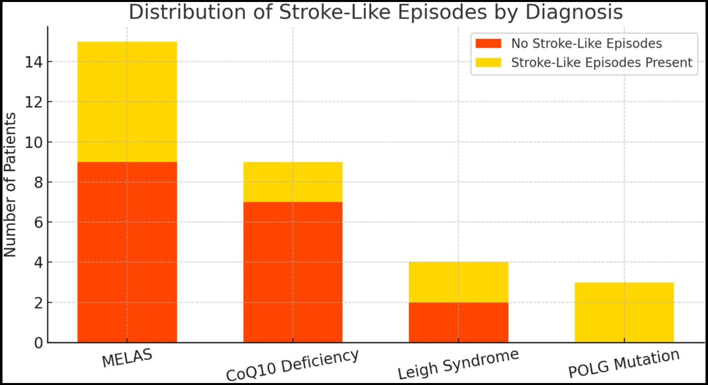 Conclusion: In this study, stroke-like episodes in genetically defined mitochondrial disorders were most frequently observed in MELAS and POLG mutations, and rarely in CoQ10 deficiency, Leigh syndrome cases. Cranial MRI findings are often frontotemporal in location and inconsistent with vascular distribution, and focal epileptiform activity on EEG are diagnostically significant. In MELAS, clinical improvement was observed in patients when L-arginine was initiated in the acute period. The findings emphasise that SLE should be evaluated in the differential diagnosis of sudden onset neurological symptoms in mitochondrial diseases.