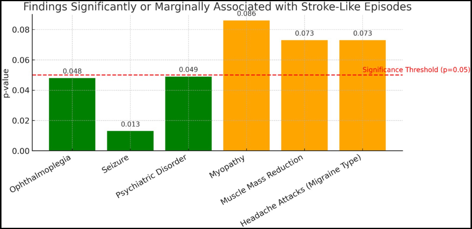 Figure 2. Distribution of stroke attacks and symptoms. In the graph, the red line indicates the significance limit (p = 0.05). Detailed distribution with statistical significance indicated.