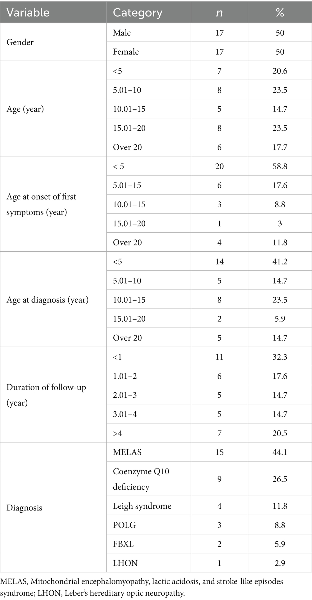 Of the 34 patients with a genetic diagnosis of mitochondrial diseases, 44.1% (n = 15) were diagnosed with MELAS, 26.5% (n = 9) with Coenzyme Q10 deficiency, 11.8% (n = 4) with Leigh syndrome and 8.8% (n = 3) with POLG mutation. There were also cases with FBXL4 mutation 5.9% (n = 2), LHON 2.9% (n = 1) (Table 1).