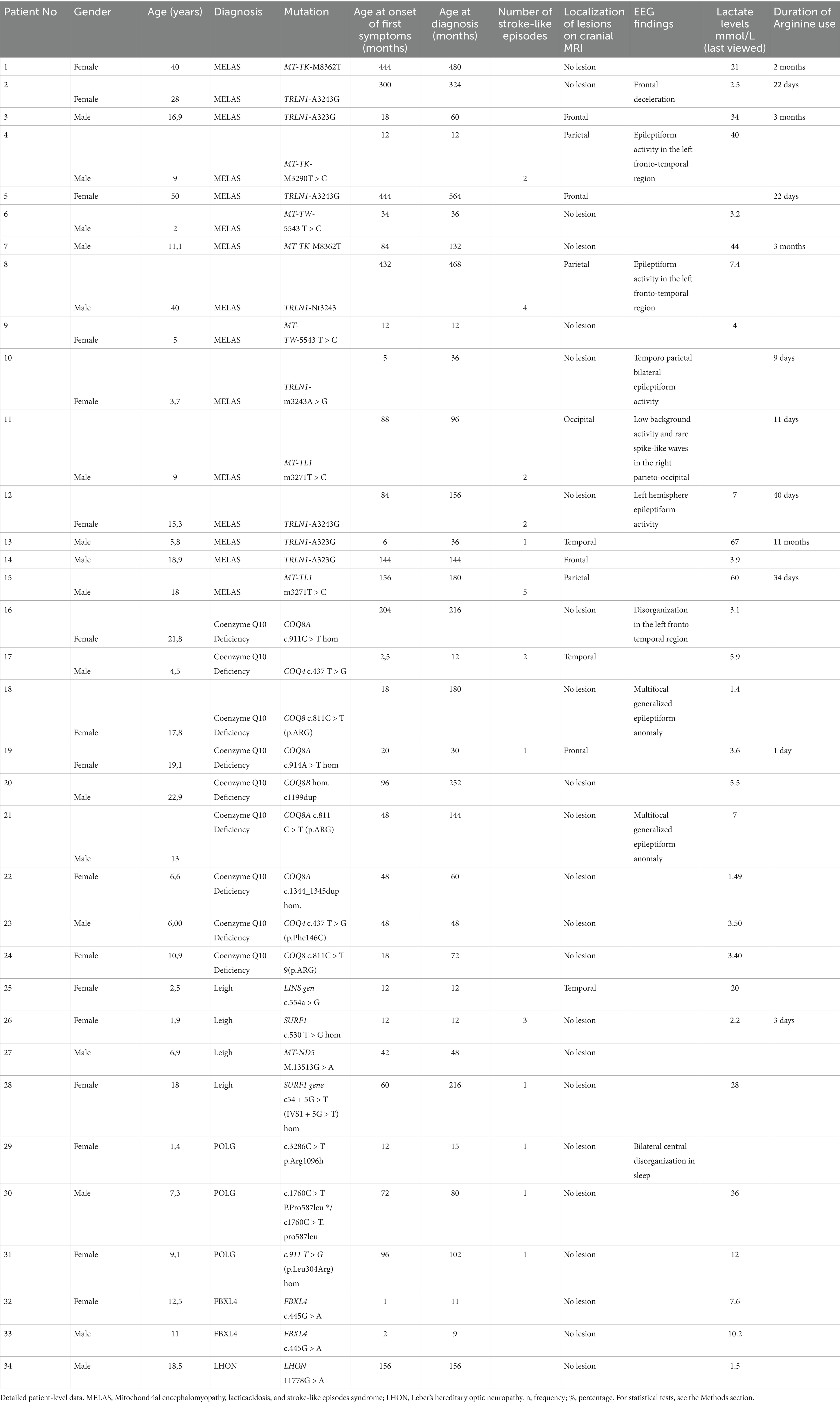 In this multicenter observational cohort study, the clinical, radiological, EEG, and genetic features of genetically diagnosed mitochondrial diseases, the frequency of stroke-like episodes, associated findings, and L-arginine treatment were evaluated. In a study by Ng YS and colleagues on the prediction of stroke-like events and outcomes in mitochondrial diseases, 111 patients aged 1–72 years diagnosed with mitochondrial disease were retrospectively evaluated (13). This study indicated that stroke-like episodes in mitochondrial diseases are also seen in the paediatric age group. In our study, we evaluated paediatric patients who experienced stroke-like episodes associated with mitochondrial disease. Although the data obtained were generally consistent with the existing literature, they also showed some remarkable differences. SLE were most frequently observed in individuals diagnosed with MELAS (44.1%), as reported in the literature (11). In the majority of these patients (66.6%), m.3243A > G mutation was found in the MT-TL1 gene, and this rate was consistent with previously reported data (14). POLG mutation stood out as the second most common cause of SLE, and this was consistent with the frequency ranking in the literature (13). Coenzyme Q10 (CoQ10) deficiency is one of the rare mitochondrial disorders that develop due to mutations in genes involved in ubiquinone synthesis. In the literature, there are a limited number of cases and small patient series in which SLE have been reported to be associated with mutations in biosynthesis genes such as COQ8A (ADCK3) and COQ4 (15, 16). In our study, SLE were observed in two of nine patients diagnosed with CoQ10 deficiency. This finding indicates that CoQ10 deficiency may rarely lead to SLE and emphasizes that neurologic symptoms should be carefully evaluated in this patient group. SLE associated with Leigh syndrome have rarely been described in the literature. In a case report, a three-month-old female infant with post-infectious encephalopathic features and neurologic symptoms, including hypotonia, apnea, and optic atrophy was diagnosed with Leigh syndrome. This case suggests that metabolic stress may trigger neurologic findings in Leigh syndrome, and the disease may present with stroke-like episodes (17). In our series, it was observed that two of the four patients with Leigh syndrome developed stroke-like episodes in relation to metabolic stress. This observation reveals that Leigh syndrome may present not only as a progressive neurodegenerative disorder but also with acute neurologic decompensations triggered by metabolic stress. It emphasizes the necessity for early diagnosis, close follow-up, and prevention of metabolic crises in this patient group. In a study conducted by Durrleman et al. (18) on 60 pediatric patients, it was reported that the first symptoms of the patients started between 0 and 28 months, and the first SLE occurred between 17 and 124 months. In a study conducted by Ng et al. (13) on Forecasting stroke-like episodes and outcomes in mitochondrial diseases, it was noted that 32% of patients experienced their first stroke episod after the age of 40. In our study, it was observed that the first symptoms usually started before the age of 5 years, and the first SLE occurred mostly in the age range of 5.01–10 years (38.4%). The youngest patient was 1.9 years old, and the oldest patient was 40 years old. This shows that the development of episodes is not limited by age and can occur at any age. Gender distribution was equal (F/M: 7/7), and gender was not a determining factor in episodes. In this respect, it differs from some studies in the literature (18). An analysis of the clinical symptoms revealed that headache was prevalent before a SLE. This was followed by decreased muscle mass, myopathy, and seizures. In a study by Xu et al. (14) involving children with MELAS syndrome, muscle weakness was defined as an indicator of severe mitochondrial dysfunction. In studies, seizures are frequently reported as the first symptom of SLE. In mitochondria-damaged cells, the increased metabolic demand associated with excessive neuronal activity during seizures cannot be met. This leads to local energy deficits, ion imbalances, and intracellular lactic acid accumulation. This situation can cause cell damage, vascular irregularities, and associated SLE. The high seizure frequency found in our study and its significant association with stroke- like episodes support the hypothesis that these episodes may be triggered by epileptic seizures (14, 18). In a study conducted by Ng et al. (13) on MELAS patients, it was reported that 91% of the patients had symptoms indicating mitochondrial dysfunction before the SLE, and the most common symptom was sensorineural hearing loss. In our series, findings such as hearing loss, cortical blindness, recurrent vomiting, and myopathy were frequently observed before SLE in individuals diagnosed with MELAS. In addition, sensorineural hearing loss was one of the most common symptoms in these patients. Although no statistical significance was found between SLE and some demographic variables such as age, gender, and BMI, low BMI in MELAS and Leigh patients is remarkable. This indicates that short stature and nutritional deficiency also accompany these patients and is in parallel with the literature (13). Studies have shown that brain lactate levels increase with disease progression in MELAS patients, and this increase reflects a progressive shift in oxidative redox potential. These findings suggest that lactate levels may be an important biomarker for monitoring the course of the disease and establishing a diagnosis (19). While studies suggested that lactate levels may be an important biomarker for monitoring the course of the disease and establishing a diagnosis, the variation does not clearly dichotamise those with or without stroke like episodes in our study. In radiologic evaluations, Durrleman et al. (18) re