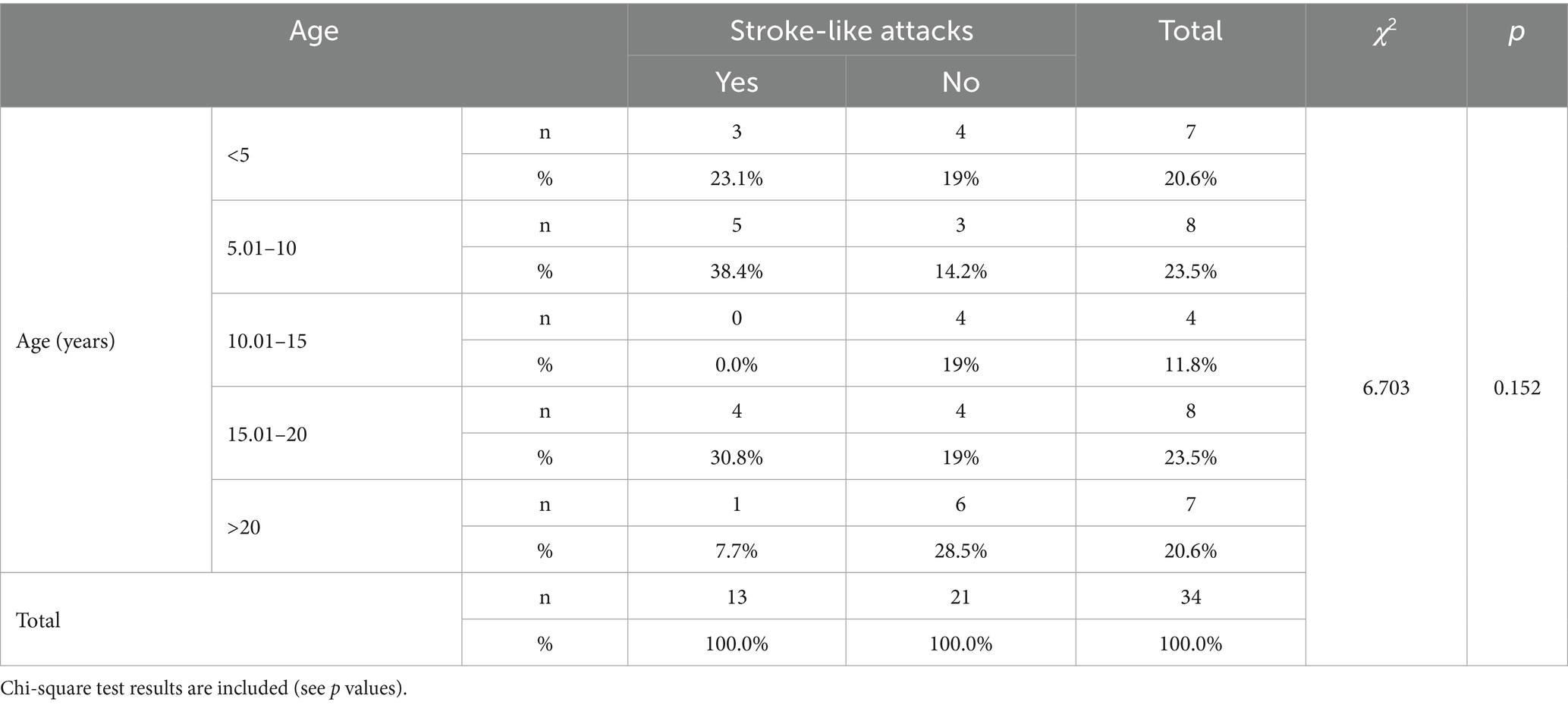 Of the 13 patients with SLE, 46.1% (n = 6) were diagnosed with MELAS and 23.1% (n = 3) with POLG. These episodes were also observed in individuals diagnosed with Coenzyme Q10 deficiency 15.4% (n = 2), Leigh syndrome 15.4% (n = 2) (Figure 1). A comparative analysis of the data reveals that the most prevalent age group experiencing SLE was 5.01–10 years (38.4%), followed by 15.01–20 years (30.8%). The highest proportion of individuals without an episode was in the age group above 20 years, with 28.5%. However, no statistically significant relationship was found between age groups and SLE (χ2 = 6.703; p = 0.152) (Table 3).