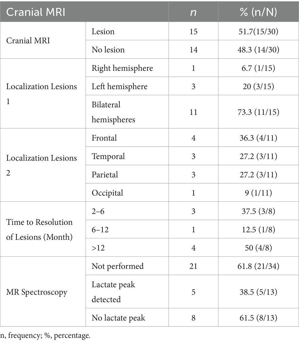 Cranial MRI revealed lesions in 15/30 of the patients. Of the lesions, 11/15 affected both hemispheres, 3/14 affected the left hemisphere, and 1/15 affected the right hemisphere. Lesions were most frequently observed in the frontal (4/11), temporal (4/11) and parietal lobes (3/11), with lower rates in the occipital lobe (1/11). Regarding lesion resolution, disappearance occurred within 2–6 months in 3/8 of patients, between 6 months and 1 year in 12.5% 1/8, and after more than 1 year in 4/8 of the patients with available data (Table 5).