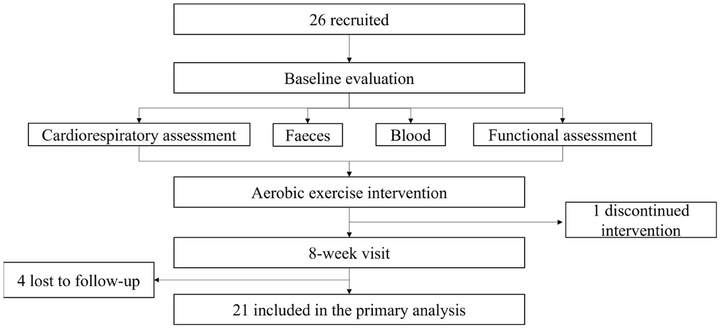 Fecal samples were collected at baseline and following 8 weeks of aerobic exercise. Participants were provided with 2 or 3 plastic devices to collect stool samples, which were stored at −80°C until DNA extraction. Participants collected their stool samples at the hospital or home, and they were asked to hand in the sample within one hour. Because most of the participants lived near the hospital, all samples were stored at −80°C in time. And transported to Novozymes for 16S rRNA amplicon sequencing using dry ice.