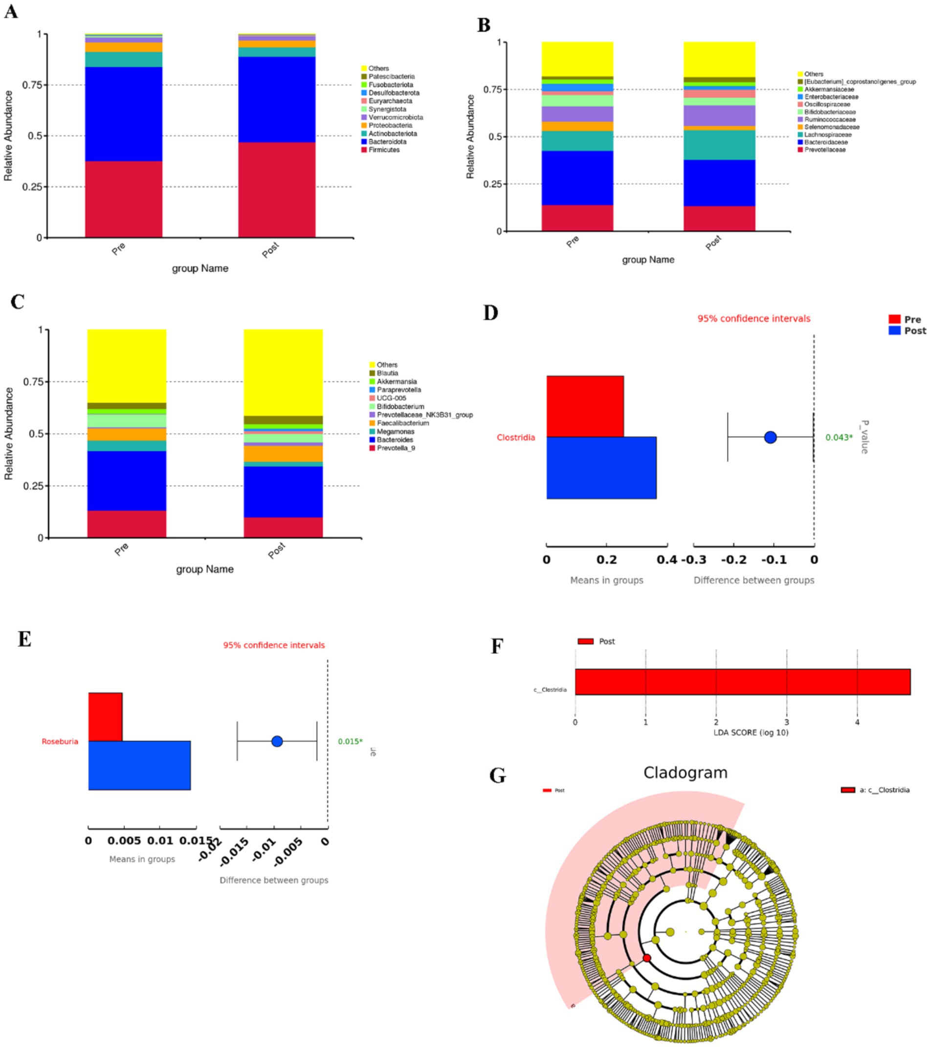 Figure 3. (A–C) Top 10 bar charts of relative abundance at the phylum, family and genus levels before and after the aerobic exercise intervention, (D) Plot of species differences between groups before and after aerobic exercise intervention at the order level, (E) Species differing between groups at the genus level, (F) Histogram of the distribution of LDA values, (G) Evolutionary branching in the Lefse analysis.