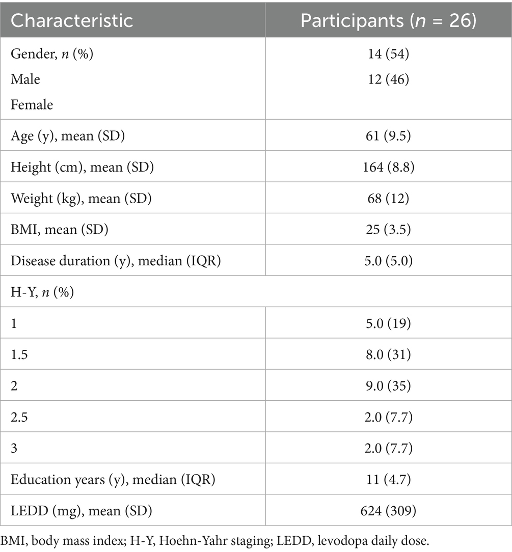 The sample size was calculated based on the primary outcome of MDS-UPDRS-III. According to the previous literature (31), people with Parkinson’s disease demonstrated a mean reduction of 4.08 in their MDS-UPDRS-III scores following an 8-week cycling intervention, with a standard deviation of 5.68. With a two-sided α set at 0.05 and a power of 90%, the PASS 15 software computed a sample size of 23. Factoring in an estimated 10% attrition rate for study visits, the final number of participants required for inclusion was determined to be 26.