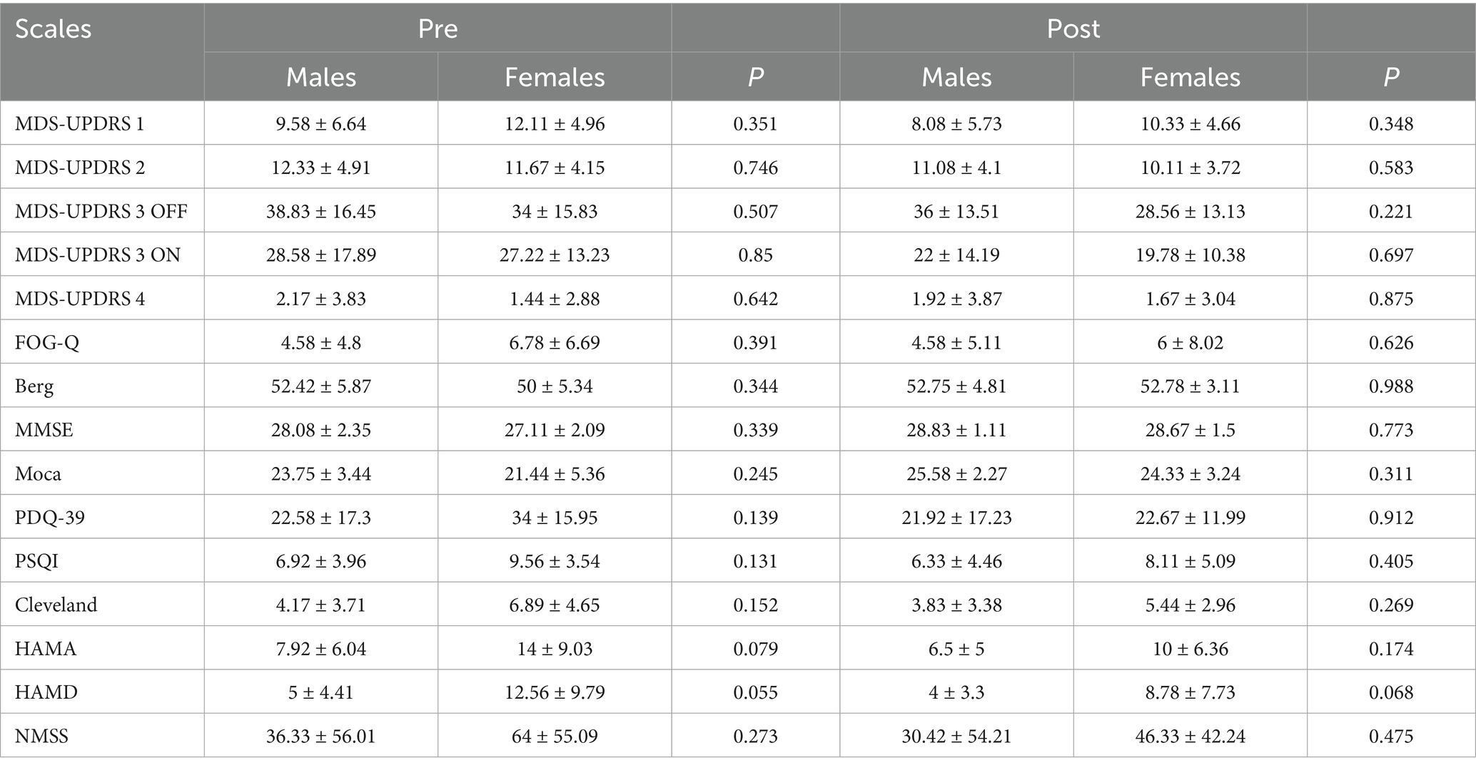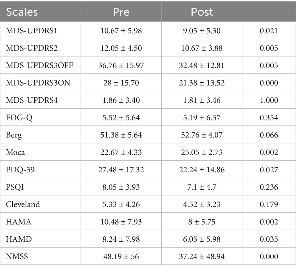 In addition, subgroup analyses were done in order to compare differences in clinical performance between PD patients of different genders at baseline and post-intervention, and the results suggest that there was no significant difference in the clinical presentation of PD males and females at baseline and post-intervention in this study (Table 3).
