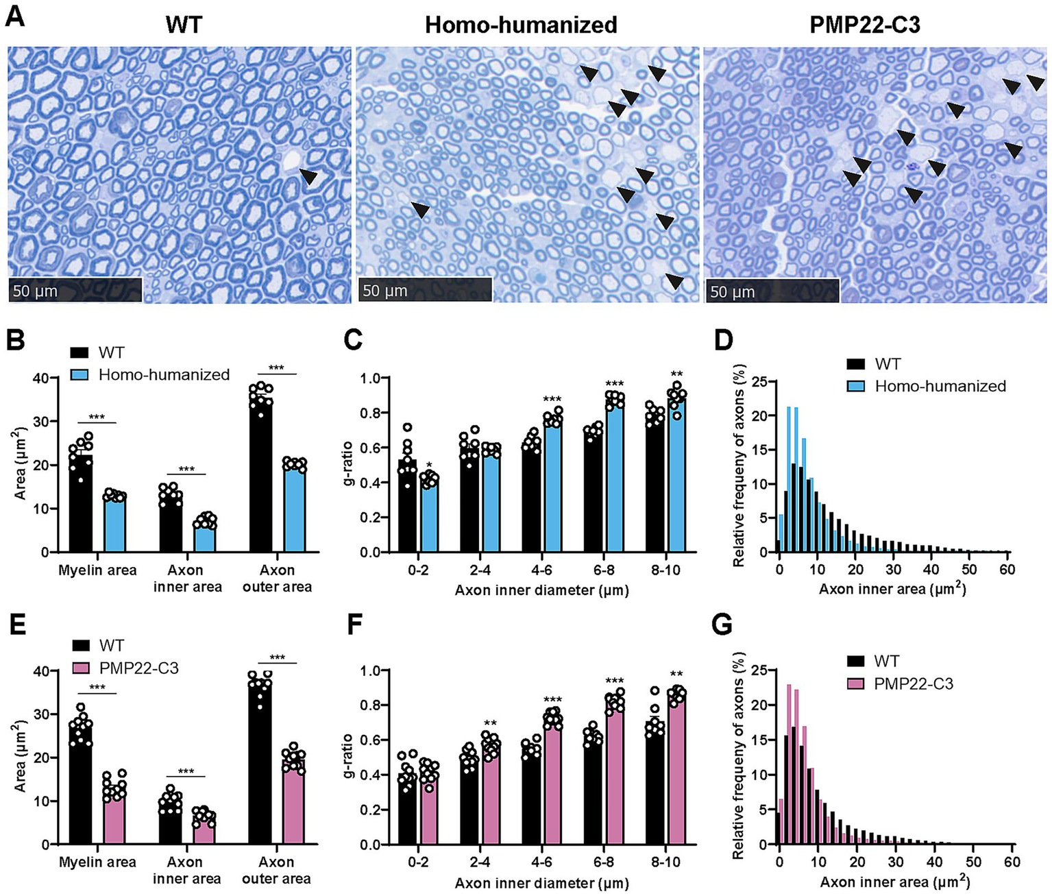Histopathological analysis in the sciatic nerve of homo-humanized mice and PMP22-C3 mice. (A) Representative images of toluidine blue-stained sciatic nerve in WT, homo-humanized, and PMP22-C3 mice at 18 weeks of age. Demyelinated axons are pointed with black arrowheads. (B,E) Myelin area, axon inner area, and outer area in WT and (B) homo-humanized mice or (E) PMP22-C3 mice. (C,F) The g-ratio of each axon in WT and (C) homo-humanized mice or (F) PMP22-C3 mice was analyzed by axon size. (D,G) Comparison of histograms for axon inner area in the sciatic nerve of WT and (D) homo-humanized mice or (G) PMP22-C3 mice. Analyzed axon frequencies from all animals are plotted for each given axon inner diameter with a 2 μm2-bin. Data are represented as mean ± SEM (n = 8–10/group). Statistical comparisons were performed using Mann–Whitney U test (*p < 0.05, **p < 0.01, ***p < 0.001 vs. WT mice). WT, wild-type; SEM, standard error of the mean.