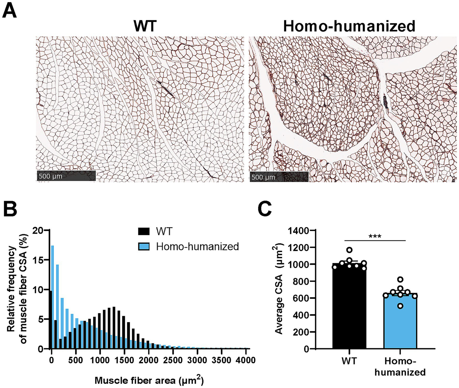 Histopathological analysis of the GC muscle in homo-humanized mice. (A) Representative images of laminin-stained cross sections of the GC muscle in WT and homo-humanized mice at 18 weeks of age. (B) Comparison of histograms for muscle fiber CSA in the GC muscle of WT and homo-humanized mice. Analyzed muscle fiber frequencies from all animals are plotted for each given muscle fiber CSA with a 100 μm2-bin. (C) Average muscle fiber CSA in the GC muscle calculated from individual animal values. Data are represented as mean ± SEM (n = 8/group). Statistical comparisons were performed using Student’s t-test (***p < 0.001 vs. WT mice). GC, gastrocnemius; WT, wild-type; CSA, cross-sectional area; SEM, standard error of the mean.
