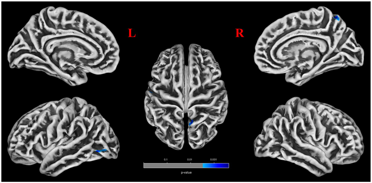 SBM, surface-based morphometry; POAG, Primary open-angle glaucoma; HCs, healthy controls. The cool color regions representing significantly thinner cortical regions in patients with POAG (FDR, voxels p < 0.001, clusters p < 0.05). The color bar indicates the voxel-wise p-value. POAG, Primary open angle Glaucoma.