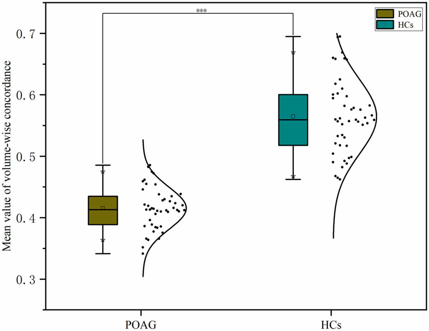 Volume-wise Rs-fMRI concordance differences between patients with POAG and HCs were compared using voxel-based two-sample t-tests, with sex, age, and education years as nuisance covariates. Between-group differences in voxel-wise Rs-fMRI concordance were tested similarly. Multiple comparison correction was performed using Gaussian random field theory (GRF), with voxel-level p < 0.001 and cluster-level p < 0.05 (two-tailed). Baseline statistics were derived from eye examination data, analyzed using an independent-sample t-test.