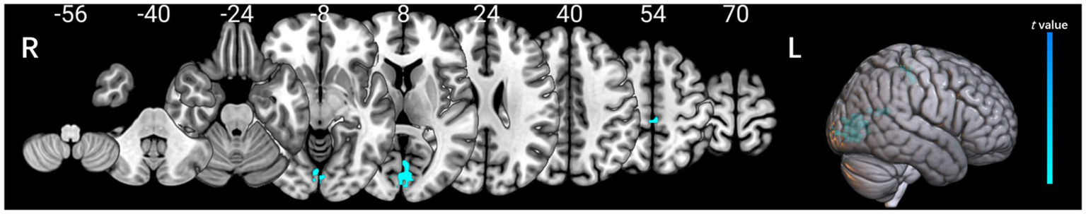No significant differences were found between patients with POAG and HCs in global GM volume, WM volume, and CSF volume after adjusting for TIV, age, sex, and education years (Figure 2). However, patients with POAG exhibited reduced cortical thickness in three clusters compared to HCs, including the left middle occipital gyrus (MOG.L), left postcentral gyrus (PoCG.L), and right precuneus (PCUN.R) (p < 0.05, FDR corrected) (Figure 2, Table 4). No clusters of sulcal depth and increased cortical thickness were observed in patients with POAG compared to HCs. Additionally, no significant differences were found in the whole-brain VBM and DBM analyses between patients with POAG and HCs (p > 0.05, FDR corrected).