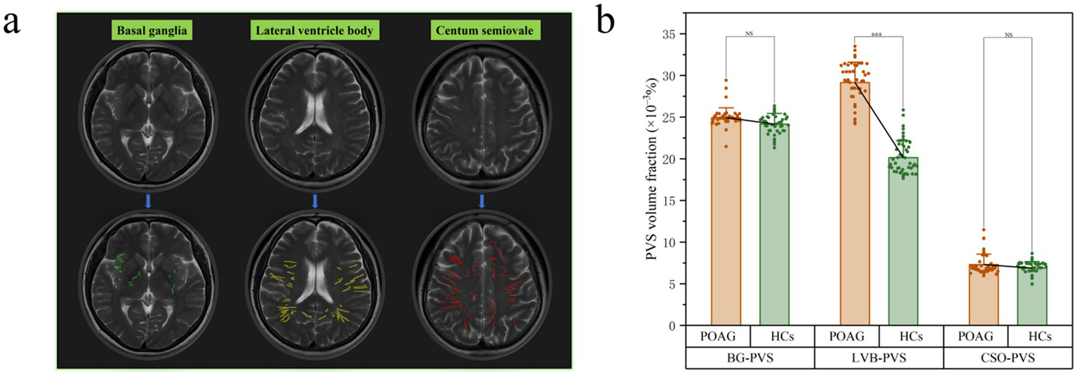 PVS volumes were quantified from T2-weighted images using ITK-SNAP software (version 3.8; http://www.itksnap.org/). Segmentation targeted the basal ganglia, centrum semiovale, and lateral ventricle body. The volume fraction was calculated as: Volume fraction = PVS volume/(GM + WM volume). PVS volume Inter-rater reliability was confirmed, with an ICC > 0.90. The PVS volume fraction was defined as the ratio of the PVS volume to the total volume of GM and WM. GM and WM segmentation was performed using the CAT12.8.1.