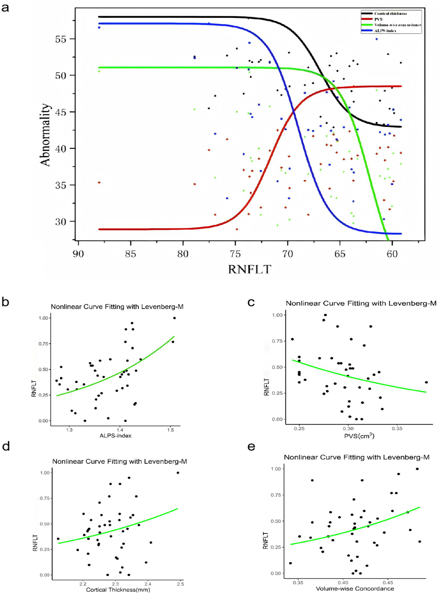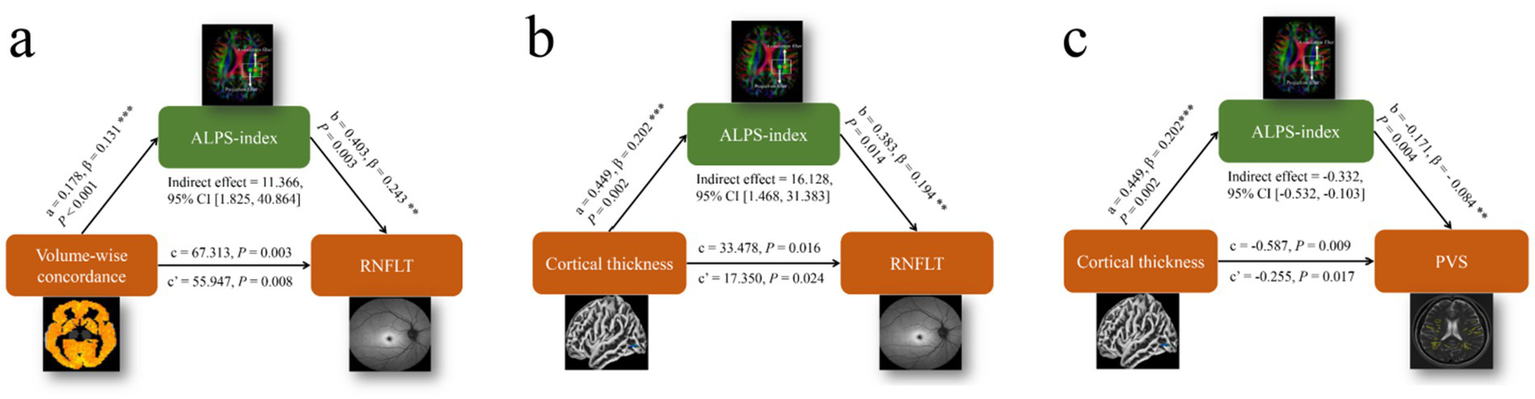 Linear regression analyses were conducted to examine the associations between clinical indicators and PVS volumes, cortical morphological alterations, Rs-fMRI concordance indices, and DTI-ALPS, with adjustments for age, sex, and years of education. To investigate sequential changes in PVS volumes, cortical morphological alterations, Rs-fMRI concordance indices, and DTI-ALPS, all data were normalized to a 0–1 scale. The logistic curves were used to model the probability of a certain outcome as a function of continuous predictors. Non-linear curve fitting models were applied to explore the relationships between these variables and RNFLT using OriginPro 2022 (OriginLab, Northampton, MA, USA). On the other hand, the mediation analysis examines whether the ALPS-index acts as a mediator between two other variables. Mediation analysis examined relationships among PVS volumes, cortical morphology, Rs-fMRI concordance indices, DTI-ALPS, and RNFLT. In this analysis, volume-wise Rs-fMRI concordance and cortical thickness of the left lingual gyrus (LING.L) were independent variables, RNFLT and LVB-PVS volume fraction were dependent variables, and the ALPS index served as the mediator, with age, sex, and years of education as covariates. The mediation analysis measures the indirect effect of the independent variable (e.g., cortical thickness) on the dependent variable (e.g., RNFLT) via the mediator (ALPS-index). Following established research methodologies (16), the mediation model was computed using PROCESS v3.4 in SPSS 25, which involved the application of model 4 (simple mediation model) from the macro created by Andrew Hayes.3 The mediation effect was considered significant if the 95% confidence interval (CI) for the indirect effect did not include zero.