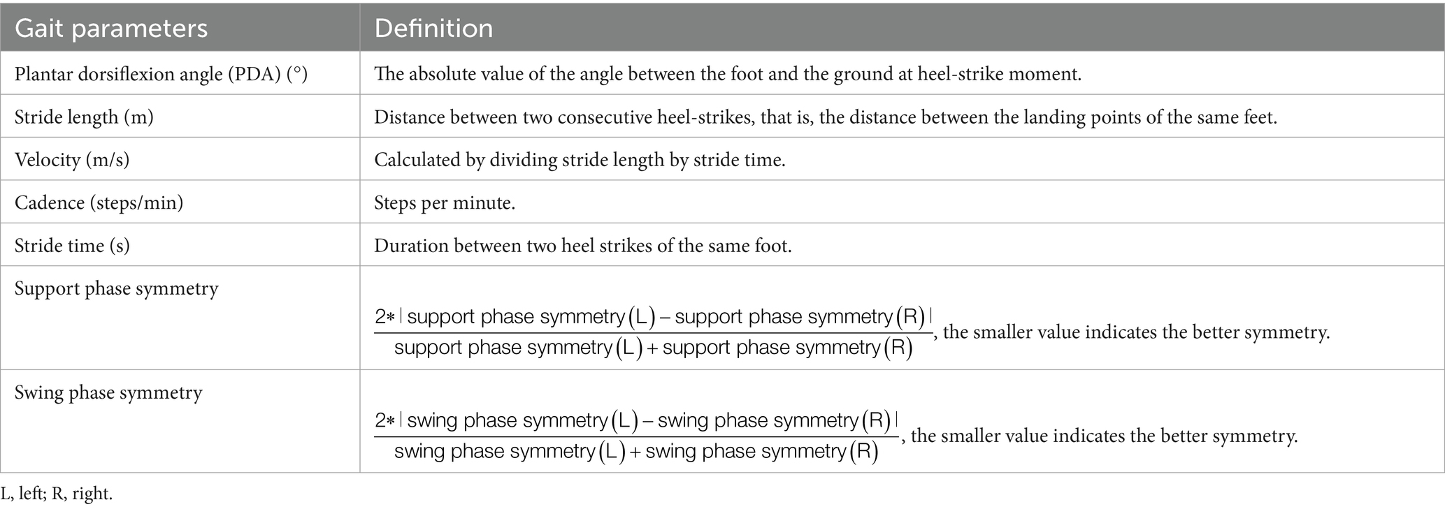 The gait parameters collected in this study include plantar dorsiflexion angle (PDA) (left/right, L/R), stride length (L/R), velocity, cadence, stride time, support phase symmetry, and swing phase symmetry (Table 1). The calculation method for gait parameters had been described in a previous study (33). All data was collected during the “OFF” state of the drugs. The participants independently completed walking on a 10-m obstacle-free path at a natural and comfortable speed. Protective facilities were provided throughout the experiment to avoid falling. At the same time, a standardized operation process was adopted, such as avoiding the interference of repetitive verbal cues on the gait pattern, and the data of the first and last steps were excluded in order to ensure the accuracy of the analysis. The accuracy of the gait data acquisition system had been validated in a previous study (34); and compared to the gold standard (optical motion capture), the position estimation error is <1% with regard to three-dimensional motion.