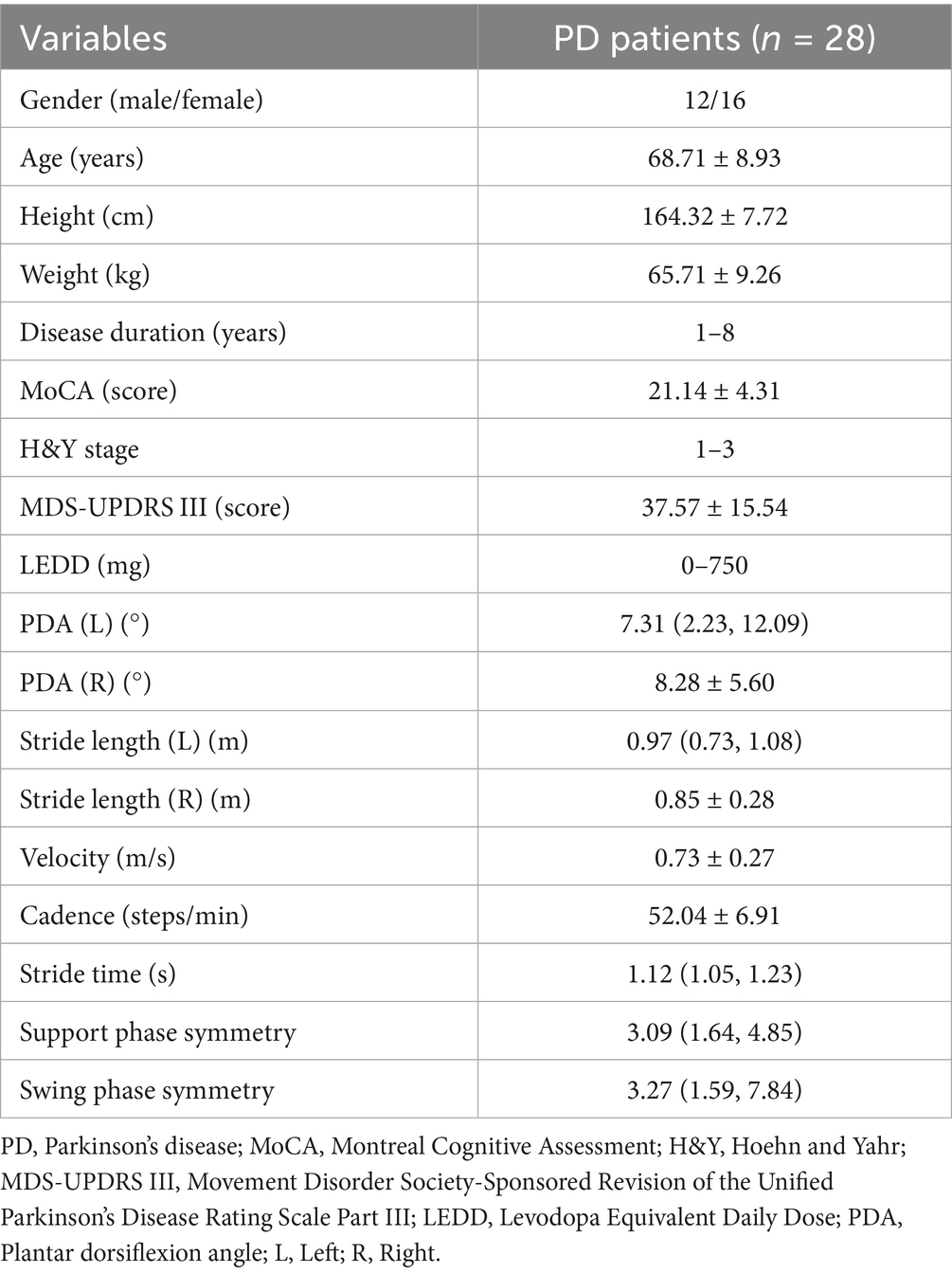 A total of 28 patients with primary PD were included in this study, with 12 men and 16 women. The inclusion criteria were as follows: (1) meeting the diagnostic criteria for primary PD established by the Movement Disorder Society (MDS) in 2015 (29); (2) H&Y stage ranged from 1 to 3; (3) age ≥40 years; and (4) being able to complete the test independently without the assistance of others. The exclusion criteria included the following: (1) Atypical Parkinsonian syndrome; (2) severe systemic and other neurological diseases; and (3) uncorrected visual impairments or diseases that may change gait patterns. This study was approved by the Ethics Committee of Central Hospital of Dalian University of Technology (YN2022-039-57). Each participant signed a consent form before participating in this study.