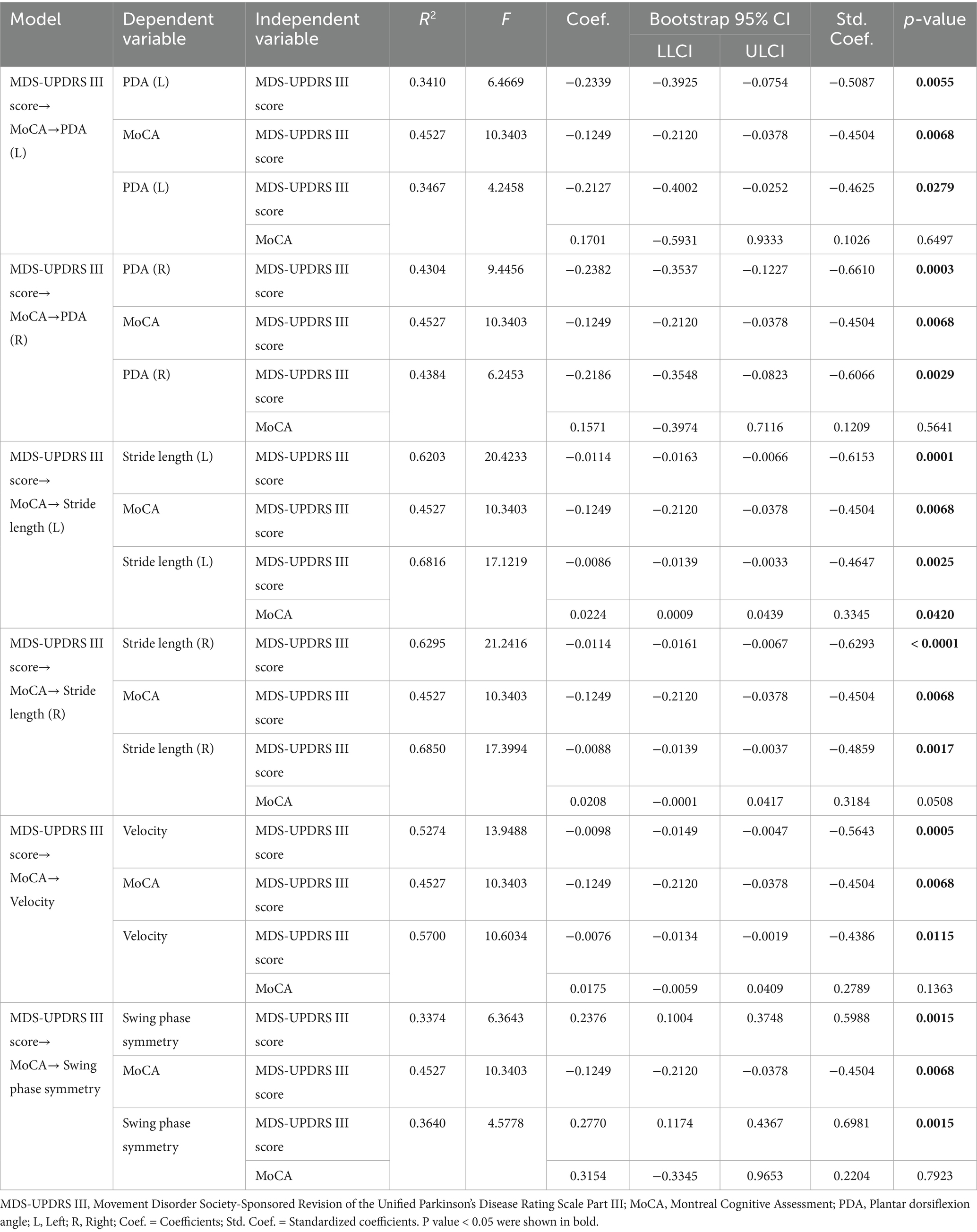 Theoretically, these results support a mediation effect of MoCA on stride length. Practically, they guide targeted interventions: motor-focused training for PDA/velocity/swing phase symmetry abnormalities, combined motor-cognitive training for stride length reduction, and age-aware assessment for velocity issues in PD patients.