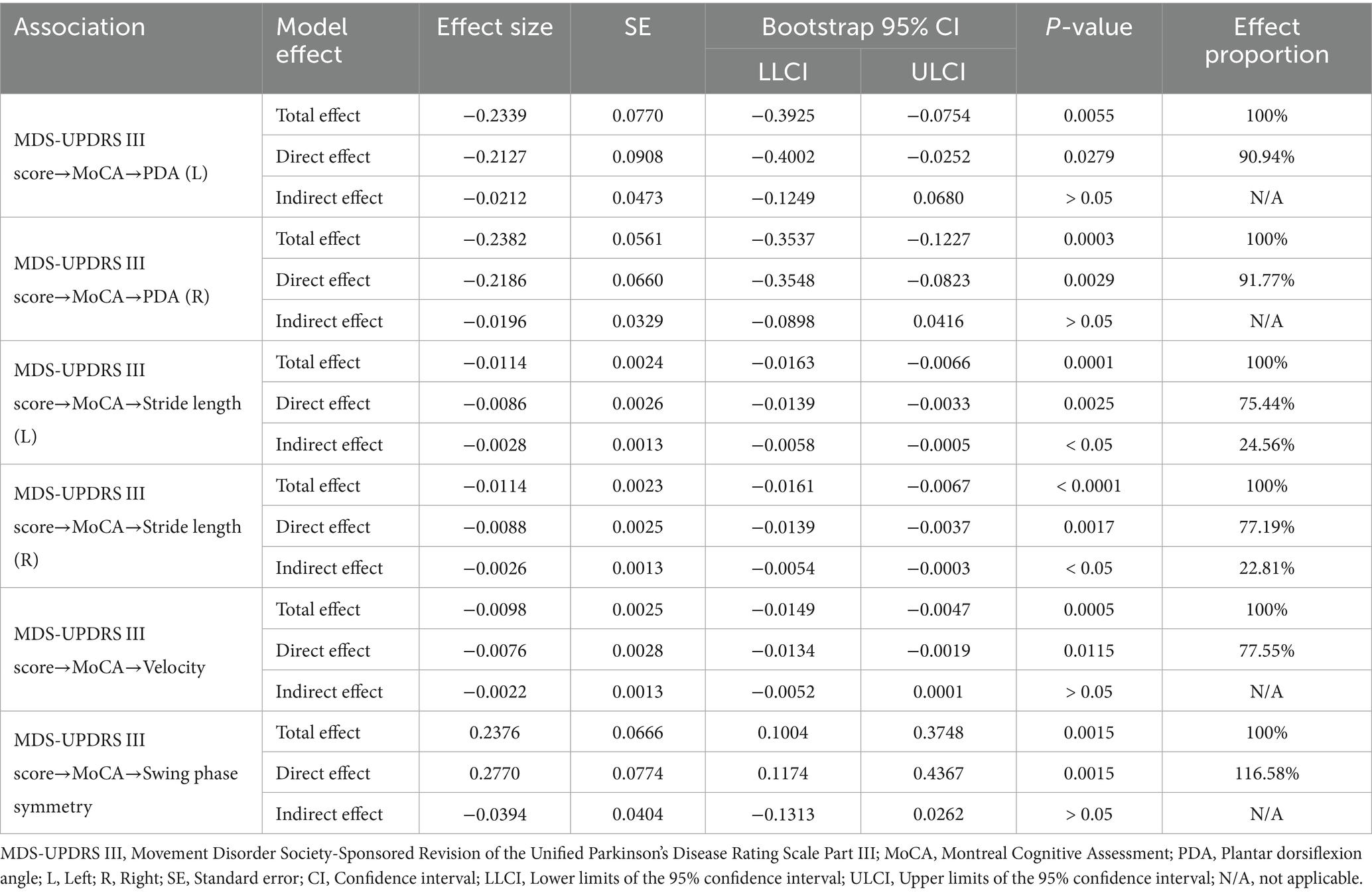 As shown in Table 4, the upper and lower limits of the 95% CI of the total effect, direct effect, and indirect effect did not include 0. This finding indicated that a higher MDS-UPDRS III score was associated with shorter stride length (direct effect L: 75.44%, direct effect R: 77.19%), and this association was partially mediated by the MoCA score (indirect effect L: 24.56%, indirect effect R: 22.81%).