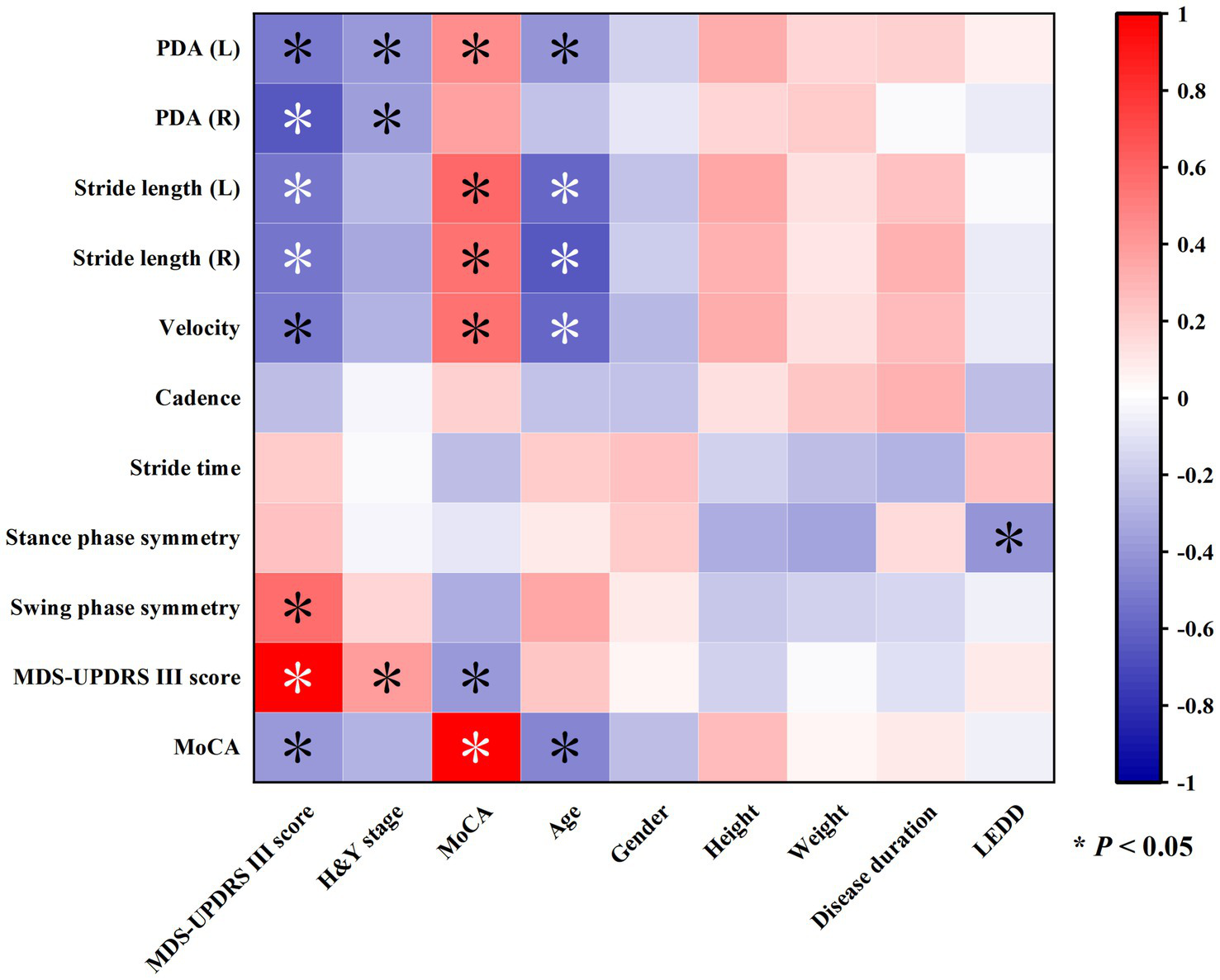 Heatmap showing correlations among various gait and clinical parameters. Colors range from red to blue, indicating positive and negative correlations, respectively. Asterisks mark significant correlations with p-values less than 0.05.