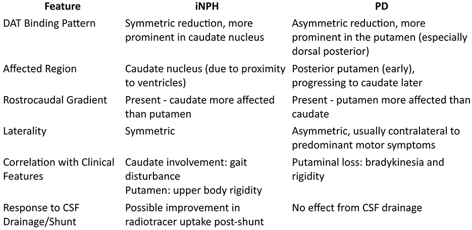 Figure 1. A schematic comparison of dopaminergic imaging findings in patients with iNPH and PD. Key features such as DAT binding patterns, affected regions, rostrocaudal gradient, laterality, correlation with clinical symptoms, and response to CSF drainage are summarized.