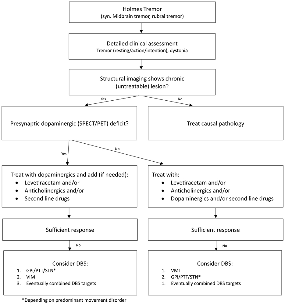 Based on the literature and our experience, we propose the treatment algorithm shown in the Figure 2 for HT patients. Two cases have shown the reversibility of the symptoms as well as dopaminergic imaging findings after treating the underlying condition, suggesting potential regeneration of the nigrostriatal system (41). Aubignat documented a completely normalization of dopaminergic imaging after surgical intervention of the temporal arachnoid cyst that led to HT (43).