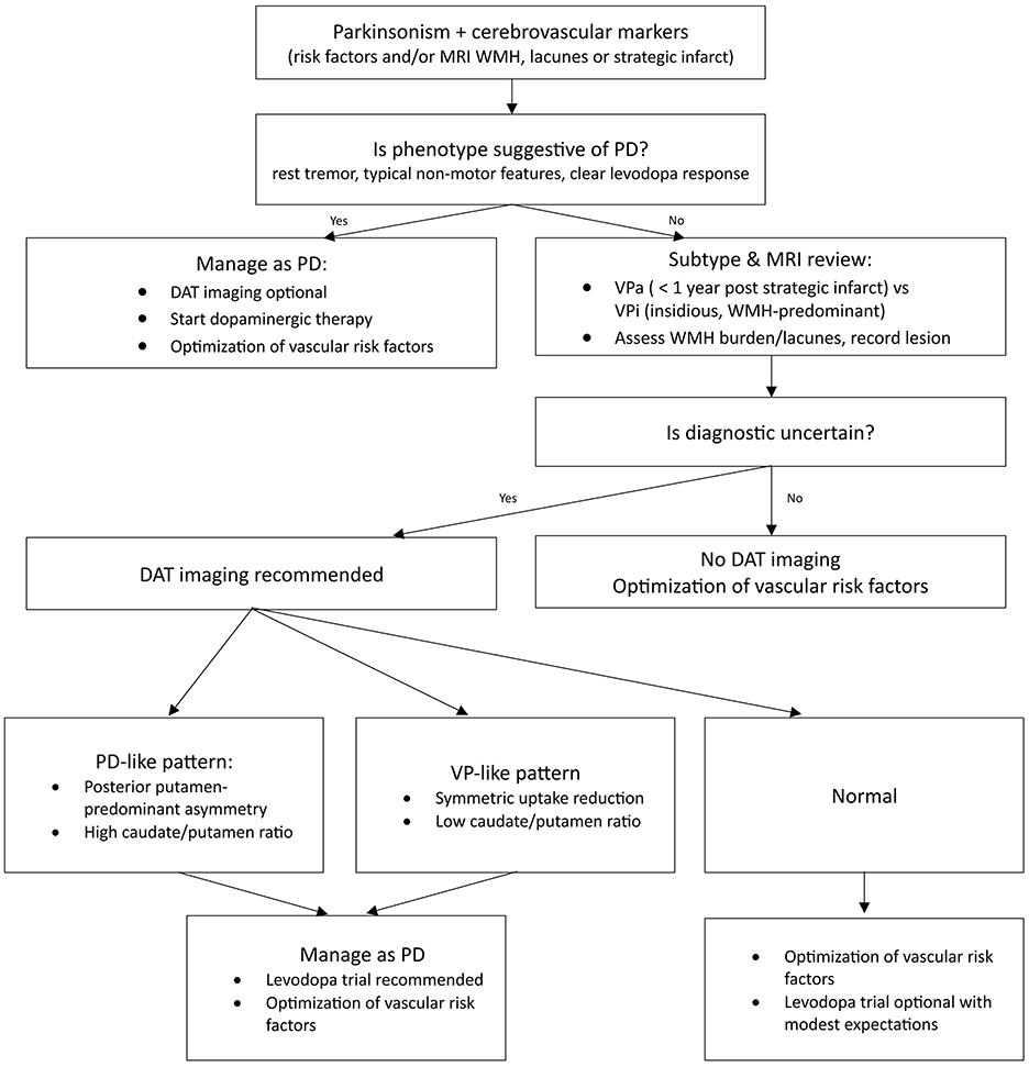 Figure 3. Diagnostic and treatment algorithm for patients with VP. This flowchart outlines the clinical assessment and imaging-guided management in VP. It summarizes clinical triage and MRI review for WMH, lacunes and strategic lesions. Obtain DAT imaging when diagnosis remains uncertain; interpret patterns as PD-like (levodopa trial recommended), VP-like (levodopa trial recommended) or normal (levodopa trial optional).