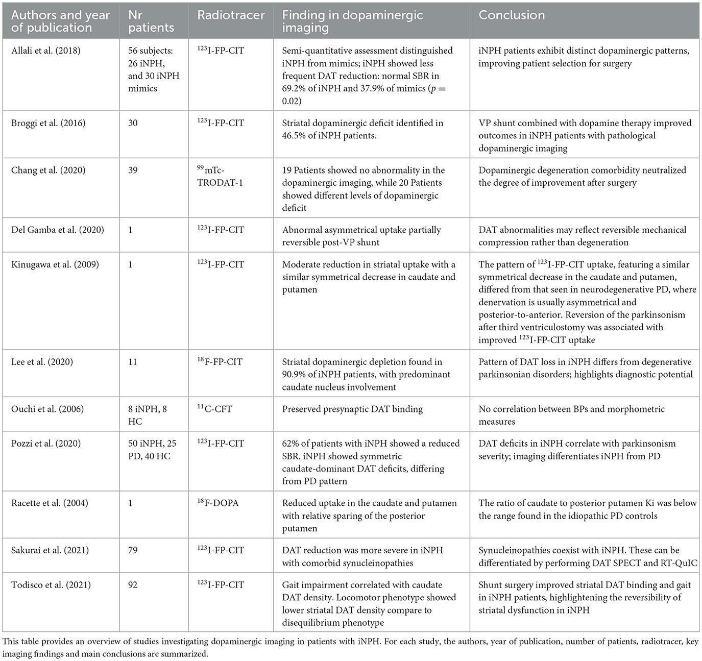 Studies investigating DAT imaging in iNPH report heterogeneous results (see Table 1). While Ouchi et al. (19) found preserved presynaptic activity in 8 iNPH patients, larger series and a case report have reported reduced DAT density with a prevalence varying from 31 to 62% of iNPH patients (26–29), or even up to 91% in one case series (30). However, the reduction in SBR uptake seems more prominent in PD, PDD and LBD compared to iNPH (24).