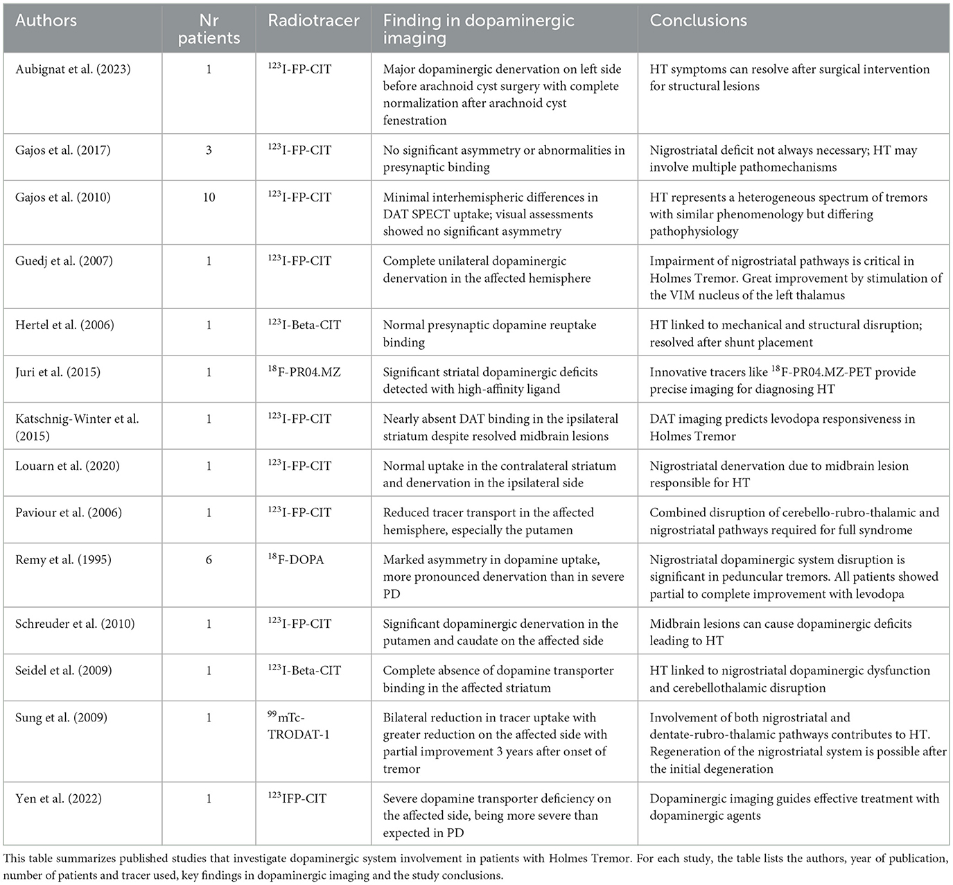 Overall, these studies and case reports underscore the critical role of dopaminergic imaging in diagnosing and understanding the pathophysiology of HT, particularly in assessing striatal dopaminergic denervation and predicting treatment response to dopaminergic agents (Table 2).