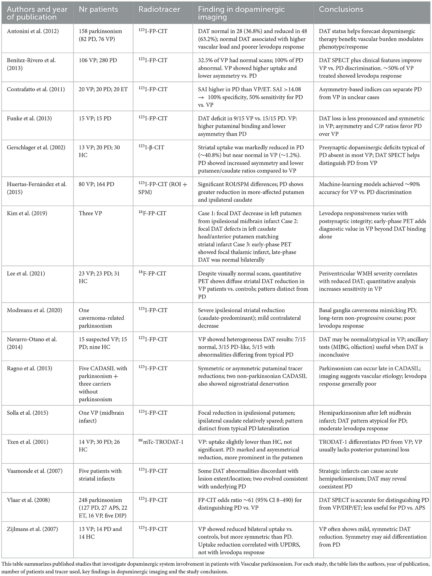 While presynaptic dopaminergic imaging can aid distinguishing VP from PD, especially when combined with semi-quantitave metrics and clinical context, it cannot reliably confirm or exclude VP on its own. Given the frequent coexistence of VP and PD, assessing potential co-pathology is essential. The role of imaging in guiding levodopa therapy remains limited (61), as non-dopaminergic mechanisms contribute significantly to VP symptomatology (53, 79). However, in patients with a DAT deficit, we suggest a pragmatic levodopa trial, as some degree of responsiveness has been observed. Moreover, this trial can aid in distinguishing VP from PD, particularly in cases where postural instability and gait disorder (PIGD) subtype of PD is suspected. Given these complexities, VP management requires a broader approach, addressing vascular risk factors and tailoring treatment strategies based on the individual patient's imaging findings and clinical presentation (12). See Table 3 for study-level details and Figure 3 for a suggested imaging-guided algorithm.