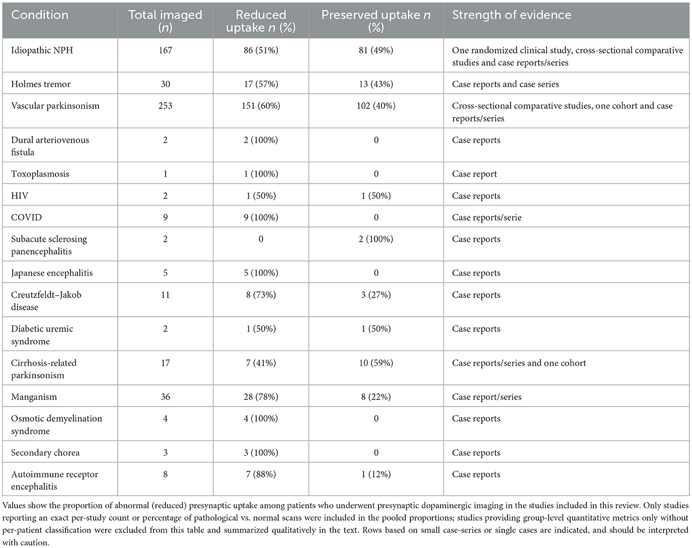 Clinically, movement disorders are uncommon in cerebral toxoplasmosis (CTx) and tend to be hyperkinetic, parkinsonism is rare. To our knowledge, there is only one case report documenting a (unilateral) presynaptic dopaminergic striatal deficit (90). Parkinsonism improved with levodopa after other treatments failed (90). CTx-related parkinsonism is likely due to direct damage to the substantia nigra rather than the basal ganglia, which would rather cause a postsynaptic dopaminergic deficit, as evidenced in this case by Magnetic resonance imaging (MRI) and dopaminergic imaging (90). Given the case-level nature of the evidence, the prevalence of presynaptic dopaminergic imaging abnormalities in CTx cannot be estimated, and presynaptic imaging should be considered selectively for atypical presentations or when a co-pathology is in the differential.