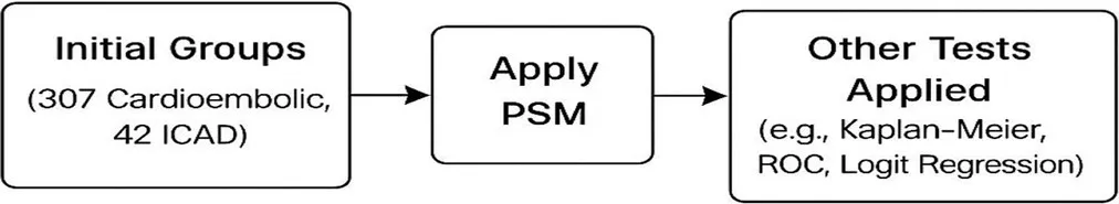 PSM was applied to improve the comparability between the ICAD group (n = 42) and the cardioembolism group (n = 307). This matching process enabled a robust and balanced comparative analysis between the two groups, minimizing potential confounding biases. After applying PSM to a randomly selected sample of 82 patients, baseline confounders between the ICAD and cardioembolic groups were controlled, allowing for valid comparisons through matched cohorts with similar baseline characteristics.