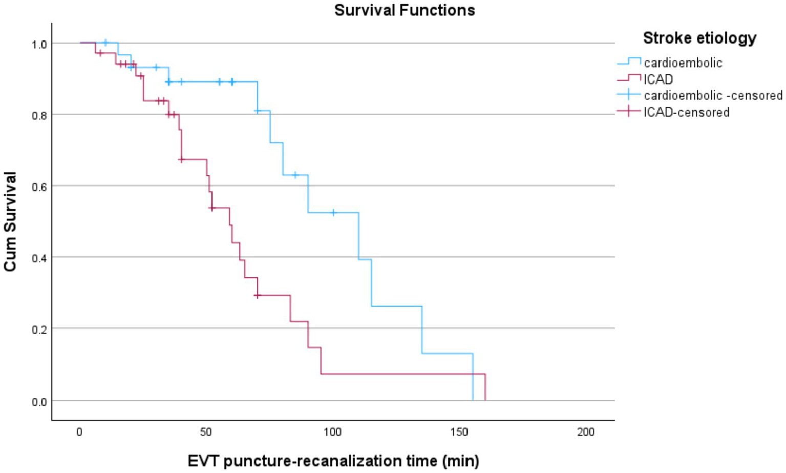 Ordinal regression was used to explain the correlation between the mRS and mTICI scales. Kaplan–Meier survival, ROC analysis and logistic regression were used to compare ICAD vs. Cardioembolism groups after PSM. The significance level was taken as p < 0.050.