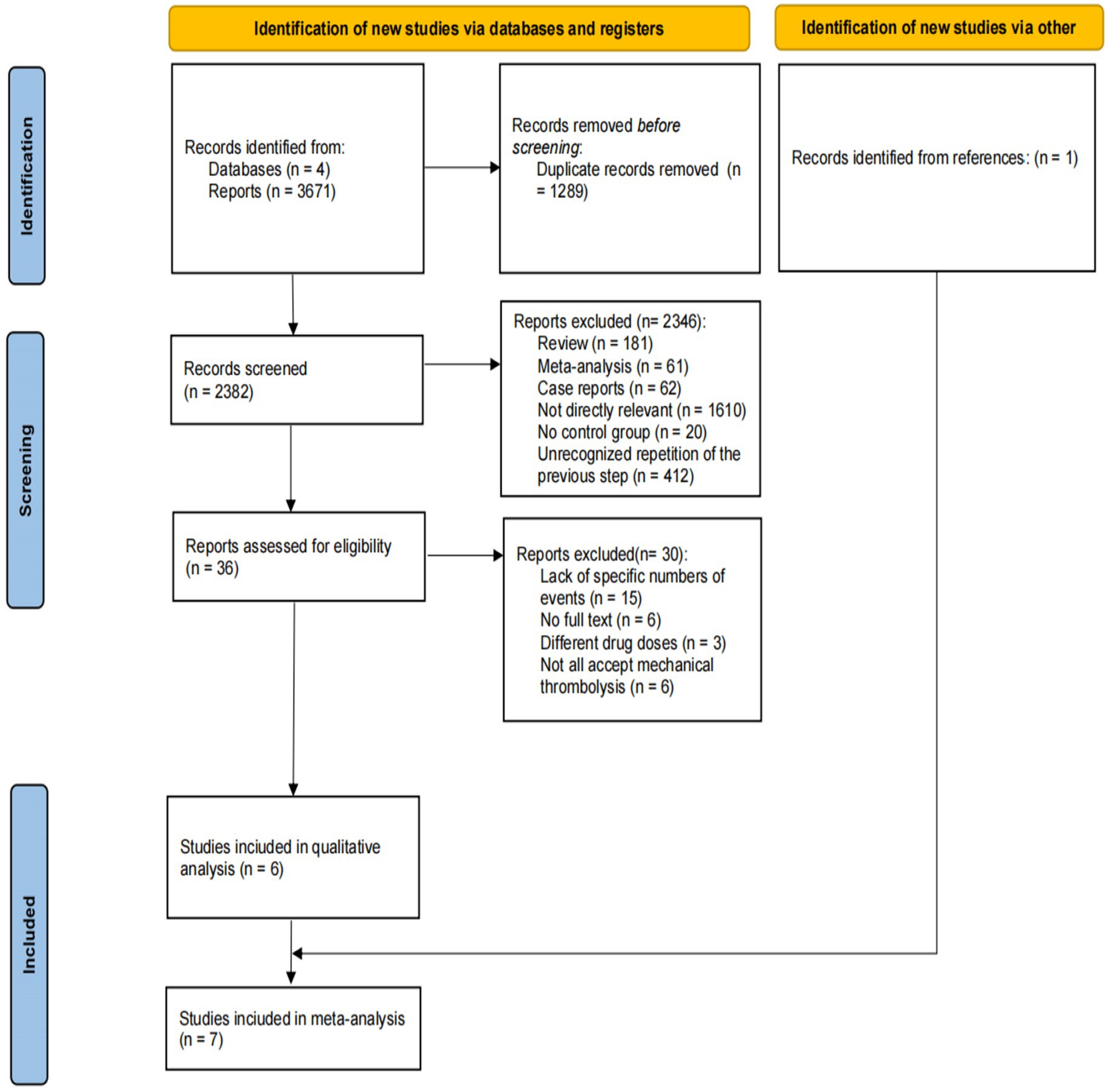 A total of 3,671 publications, which consisted of articles and conference abstracts, were retrieved from four major databases. Initially, we removed duplicate records (n = 1,289). Subsequently, we excluded records obtained from the database search that did not satisfy the inclusion and exclusion criteria of our systematic review (n = 2,346). Following an examination of titles and abstracts, 36 articles were chosen for in-depth full-text perusal. Eventually, 7 of these articles were deemed appropriate for inclusion in this meta-analysis. Only two studies were RCTs, while the remaining five were cohort studies (two prospective and three retrospective; Figure 1).