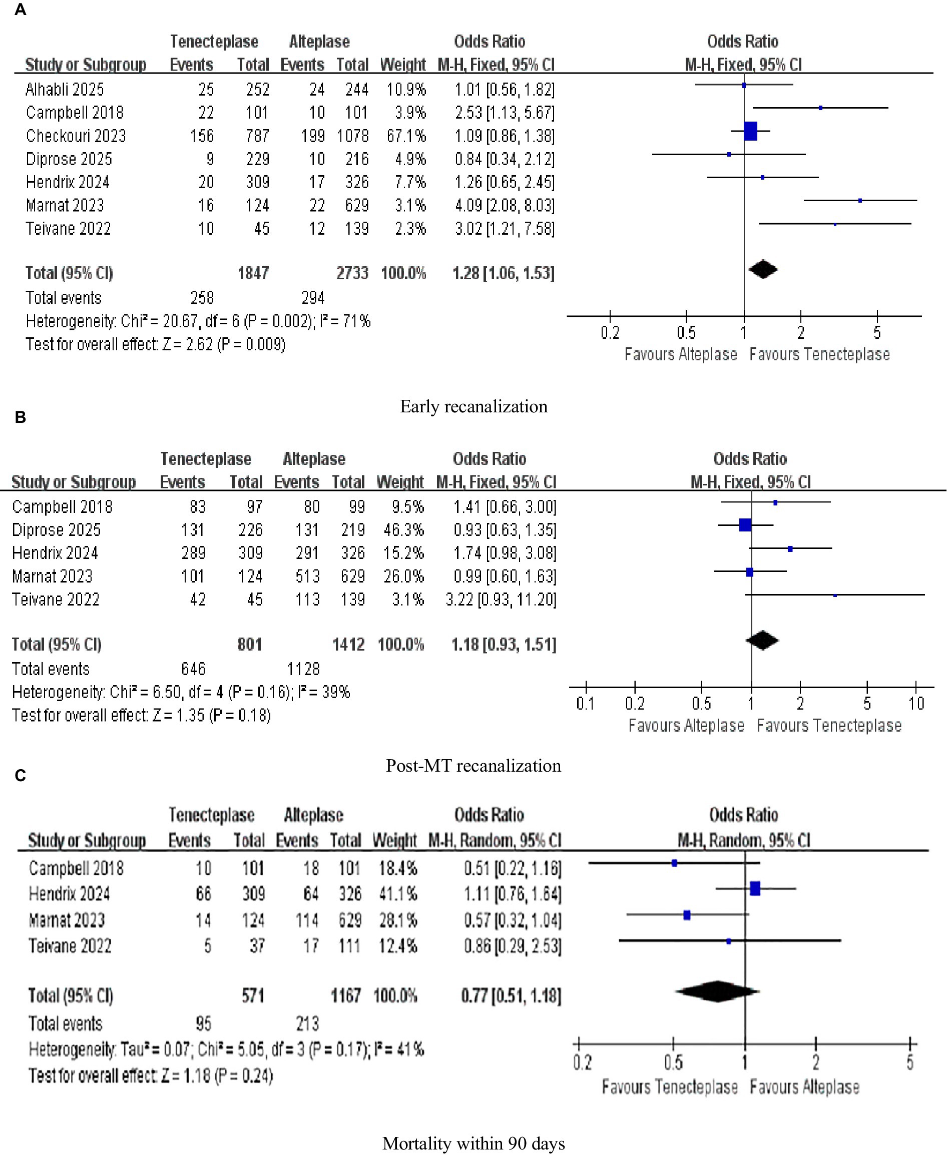 Figure 5. Forest plots for safety outcomes (A) early recanalization; (B) post-MT recanalization; and (C) mortality within 90 days. Data are odds ratios (OR) with 95% confidence intervals (CI).