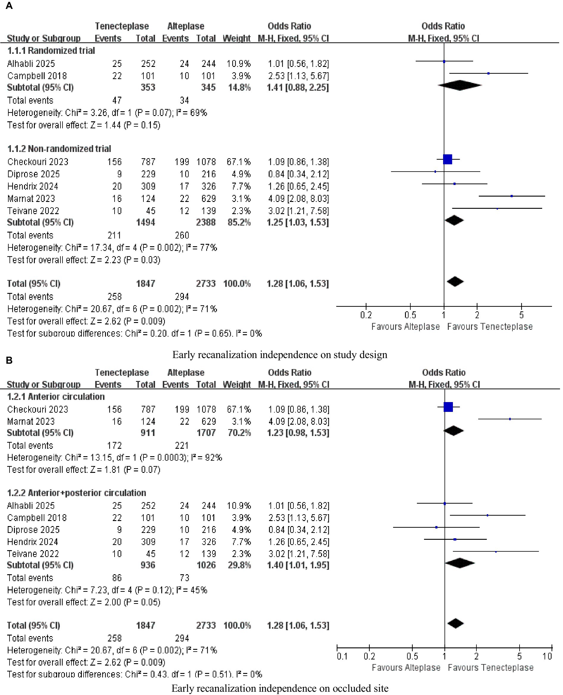 Figure 6. Forest plots for subgroup analysis (A) Early recanalization independence on study design; (B) Early recanalization independence on occluded site.
