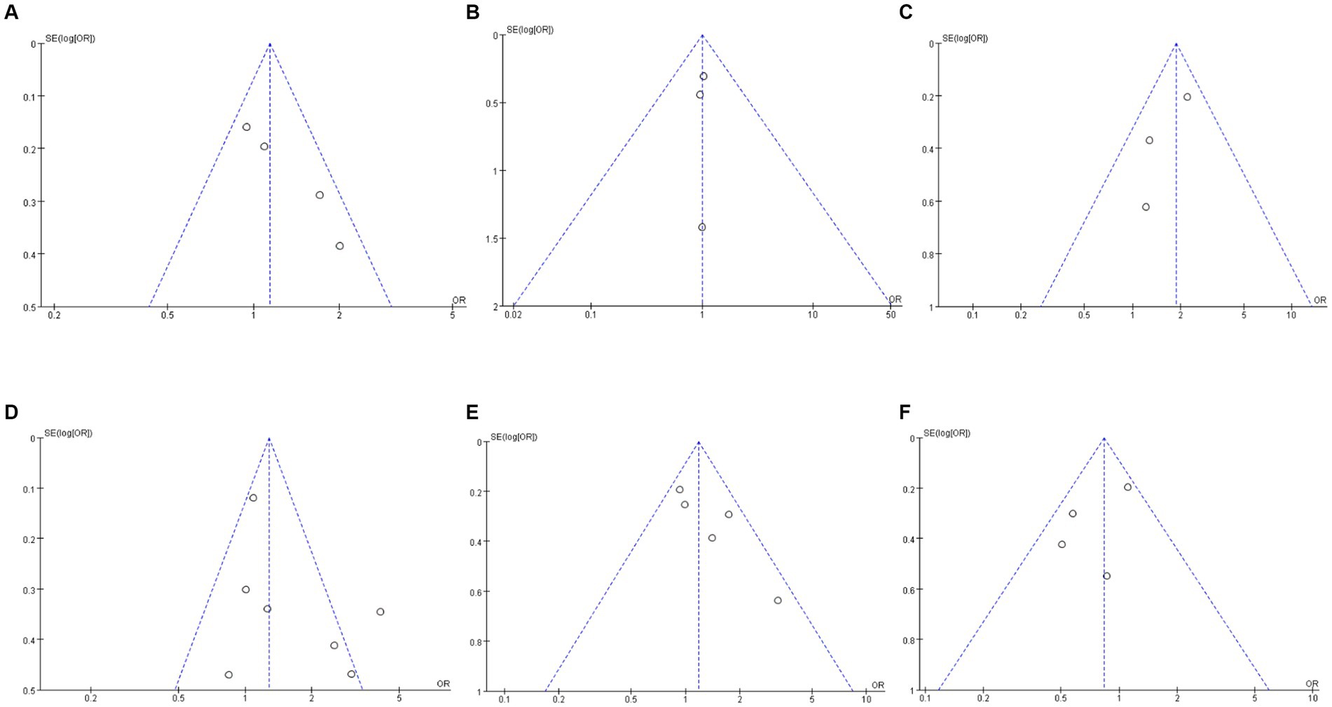 Figure 7. Funnel plot for outcomes (A) functional independence at 90 days; (B) symptomatic intracranial hemorrhage (sICH); (C) intracranial hemorrhage (ICH); (D) early recanalization; (E) post-MT recanalization; and (F) mortality within 90 days.