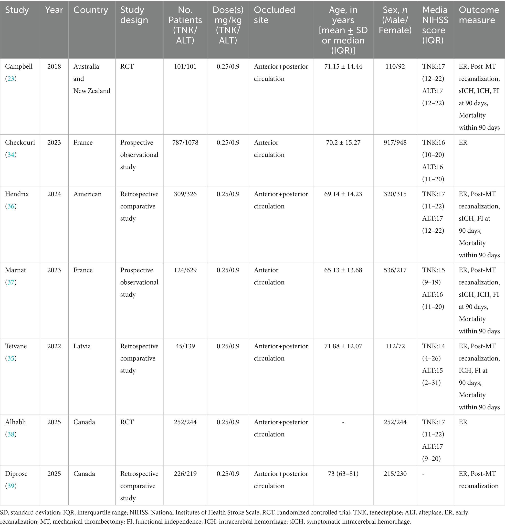 This meta-analysis encompassed a compilation of seven distinct research endeavors (23, 34–39). In total, 4,580 AIS patients who underwent MT were incorporated into this analysis. Among these patients, 1844 received TNK for thrombolytic therapy, while 2,736 were treated with ALT. The characteristics of the included studies are meticulously detailed in Table 1. In regard to the study design, this meta-analysis integrated two RCTs and five non-randomized, non-blinded cohort studies. Two of the studies employed a prospective methodology, whereas the other three studies adopted a retrospective approach. Concerning the review mechanism, all of the studies underwent a rigorous peer-review process. The study conducted by Checkouri et al. boasted the largest sample size, consisting of 1865 participants, and the study by Teivane et al. had the smallest sample size, with merely 184 participants. Five of the studies investigated both anterior and posterior circulation occlusions, while two studies specifically centered on anterior circulation occlusion. Across all the studies, the thrombolytic dosages exhibited a high degree of consistency. Intravenous TNK was administered at a dosage of 0.25 mg/kg, and ALT at 0.9 mg/kg.