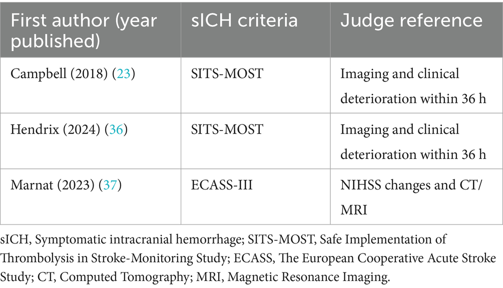 Two authors (Xiaohan Zhang and Min Tao) conducted a comprehensive review of all seven studies. From each of the final-selected studies, two reviewers independently extracted data on the quantity of patients and the outcomes of concern in the TNK and ALT groups before they underwent MT, including year, country, study design, the quantity of patients in total, the dosage of thrombolytic agent, the occluded site, age, sex, median National Institute of Health stroke scale (NIHSS) score, outcomes measure (Table 1). In the course of this data-retrieval procedure, in case any differences emerged, they were settled through dialogue and agreement after conferring with a third reviewer (Tian Wang). The main outcome measure for this study was functional independence at 90 days, which was defined as having a modified Rankin Scale (mRS) score between 0 and 2. In terms of safety, the indicators considered were sICH and ICH. ICH was characterized as any kind of intracerebral bleeding that could be detected through imaging methods or measured by a hemorrhage-related scoring system. sICH was defined as ICH that was temporally related to and directly contributing to the deterioration of the neurological condition. sICH: According to the European Cooperative Acute Stroke Study III (ECASS III) standard (Imaging confirmed ICH with an increase of≥4 points in the NIHSS score), and the Safe Implementation of Thrombolysis in Stroke-Monitoring Study (SITS-MOST) standard (sICH occurs within 36 h after IVT, and neurological deterioration is directly related to sICH). The specific definitions of sICH adopted in each included study are shown in Table 2 (30). Regarding the secondary outcomes, successful recanalization after MT was one of them. This was determined by a post-MT modified Thrombolysis in Cerebral Ischemia (mTICI) score of 2b/3, which indicated that more than 50% of the ischemic area had been reperfused (31). Another secondary outcome was the rate of early successful recanalization. This was defined as the first angiographic assessment reaching mTICI 2b/3 grade. It should be noted that some patients who achieved mTICI 2b grade may still undergo MT due to a high residual thrombus burden or insufficient perfusion. This definition may introduce potential classification bias, and the related effects have been discussed in the subsequent sections. Also included as a secondary outcome was all-cause mortality within 90 days.