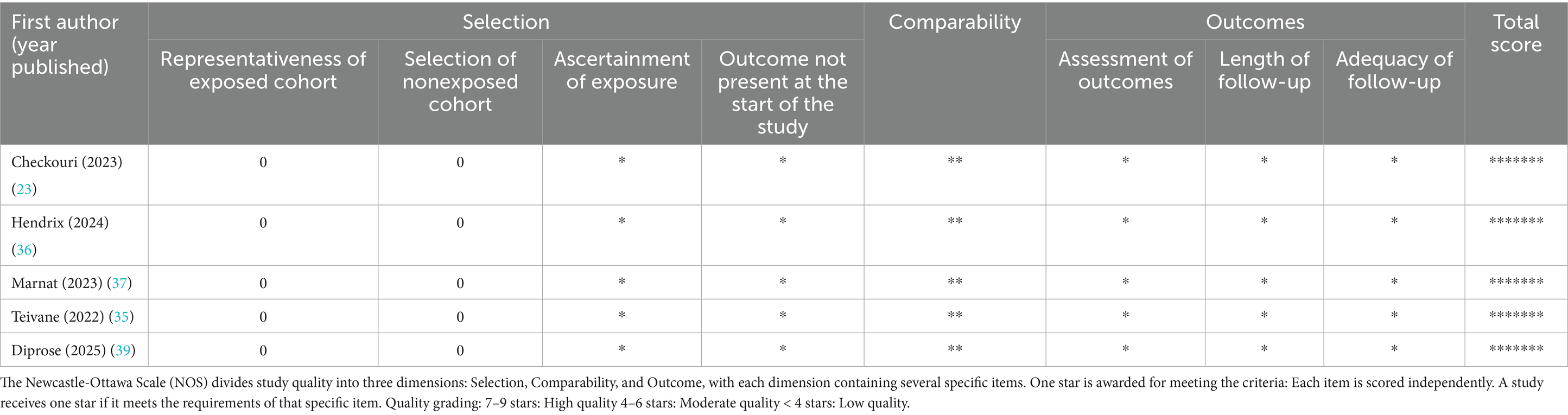 We employed the Cochrane Risk of Bias Tool to assess the quality of the two RCTs included. The bias assessment results are presented in Figure 2. Following this evaluation, both were classified as high-quality. Five research works were categorized as high-quality according to the NOS. These studies achieved NOS scores within the range of 7–9. Table 3 presents the specific NOS scores for each individual study. As a result, none of the studies were excluded from this meta-analysis. These confirms the high reliability of the findings from this meta-analysis (Table 3).