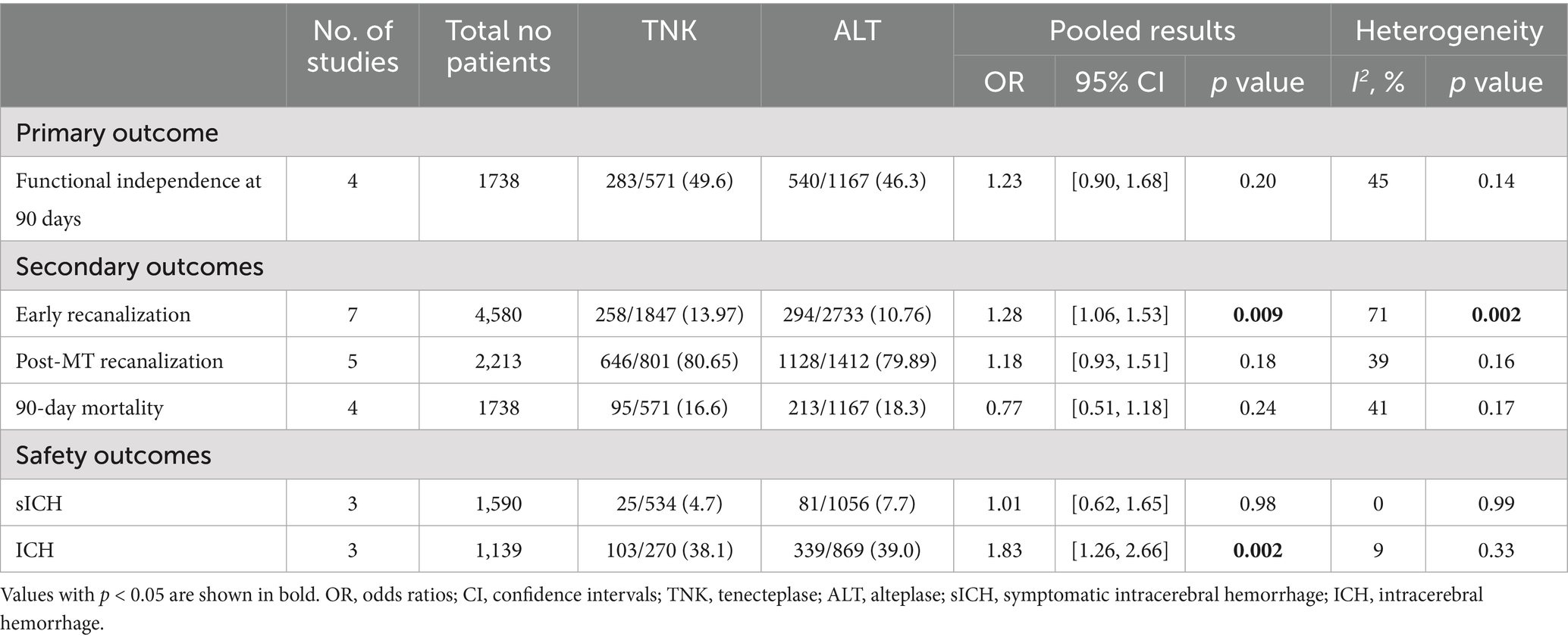 Results: In total, 7 studies involving 4,580 patients were incorporated. Patients treated with TNK exhibited comparable rates of functional independence at 90 days (odds ratio 1.23, 95% confidence interval 0.90–1.68, p = 0.2), post-MT recanalization (1.18, 0.93–1.51, p = 0.18), symptomatic intracerebral hemorrhage (sICH; 1.01, 0.62–1.65, p = 0.98) and mortality within 90 days (0.77, 0.51–1.18, p = 0.24) to those treated with alteplase. However, compared to alteplase-treated patients, those treated with TNK had higher rates of early recanalization (1.28, 1.06–1.53, p = 0.009), and a lower incidence of intracranial hemorrhage (ICH; 1.83, 1.26–2.66, p = 0.002).