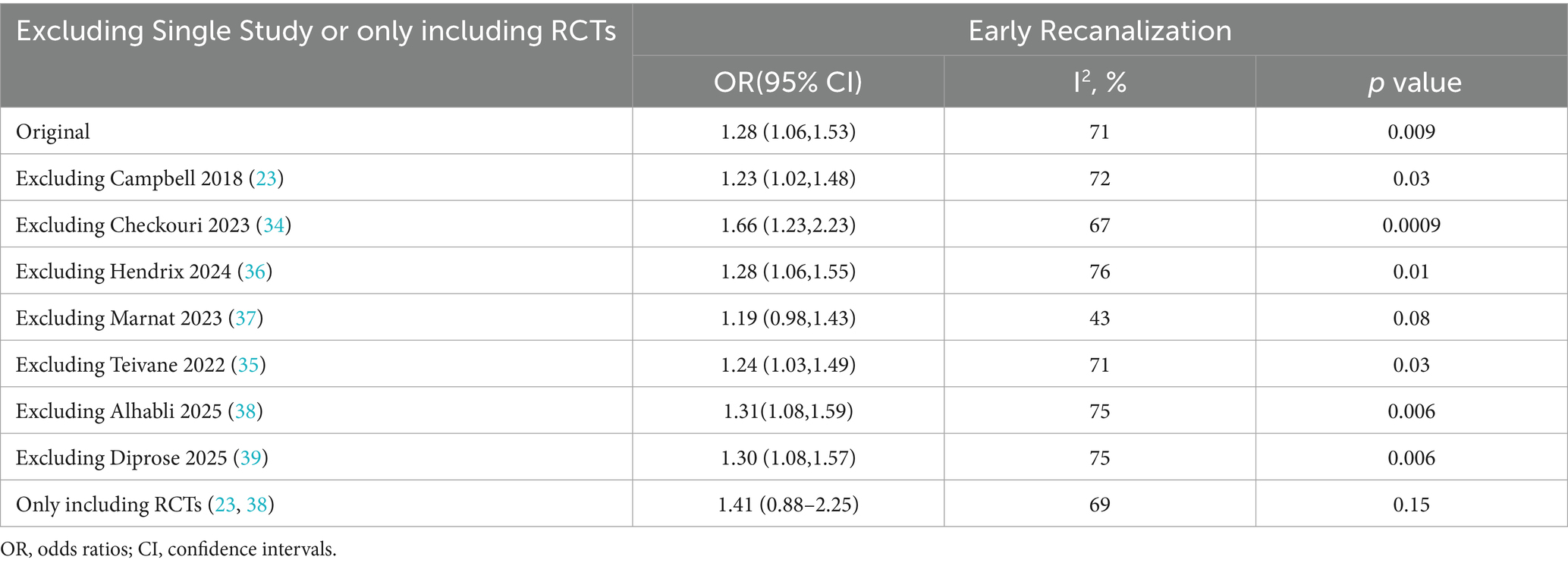 Given the presence of inter-study heterogeneity, sensitivity analyses were conducted. This involved excluding individual studies sequentially to assess the distinct influence that each study exerts on the pooled overall effect size regarding early recanalization. Throughout the analysis procedures, it was observed that the study by Marnat et al. was among the factors contributing to heterogeneity in the early recanalization outcomes (37). When this study was excluded, the heterogeneity decreased significantly, from 71 to 43% (Table 5). The potential factors contributing to the elevated heterogeneity of early recanalization in the Marnat 2023 study are as follows: First, its single-center prospective design only included patients with anterior circulation tandem occlusions, whose thrombus burden and vascular anatomy may boost TNK’s thrombolytic effect. Second, it assessed early recanalization via angiography 30 min post-thrombolysis, while other studies mostly used immediate angiography after interventional center transfer (mean 65-min interval). TNK’s short half-life (20–24 min) may make its recanalization advantage more evident earlier. Third, its patients had a significantly lower median NIHSS (15, IQR: 9–19) than other studies (median 17), and mild stroke patients are more prone to early recanalization. To reduce confounding effects of non-RCT studies, a sensitivity analysis was performed on 2 RCTs (23, 38). Results showed: early recanalization rate was 13.31% in TNK group vs. 9.86% in ALT group, with pooled OR = 1.41 (95% CI: 0.88–2.25, p = 0.15; no statistical significance, but OR close to overall analysis’s 1.28) and heterogeneity reduced to 69%, indicating non-RCTs did not overestimate TNK’s early recanalization advantage.