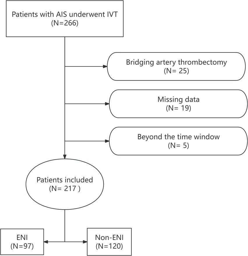 The study adhered to the Declaration of Helsinki and was approved by the Ethics Committee of our hospital. A retrospective analysis was conducted on 266 patients with AIS who underwent rt-PA intravenous thrombolysis (IVT) at our hospital’s Stroke Center between June 1, 2020, and November 30, 2024. Inclusion criteria were as follows: individuals aged ≥18 years with a confirmed diagnosis of AIS based on CT or MRI, who received IVT within 4.5 h of stroke onset. Patients were excluded if they received bridging endovascular treatment after IVT, had incomplete clinical or laboratory data, or were discharged or deceased within 24 h. After excluding 25 patients who underwent bridging artery thrombectomy, 19 with incomplete clinical data, and 5 who were beyond the 4.5-h thrombolysis time window, a total of 217 patients who received rt-PA IVT were included in the study. The flow chart for patient selection is shown in Figure 1.