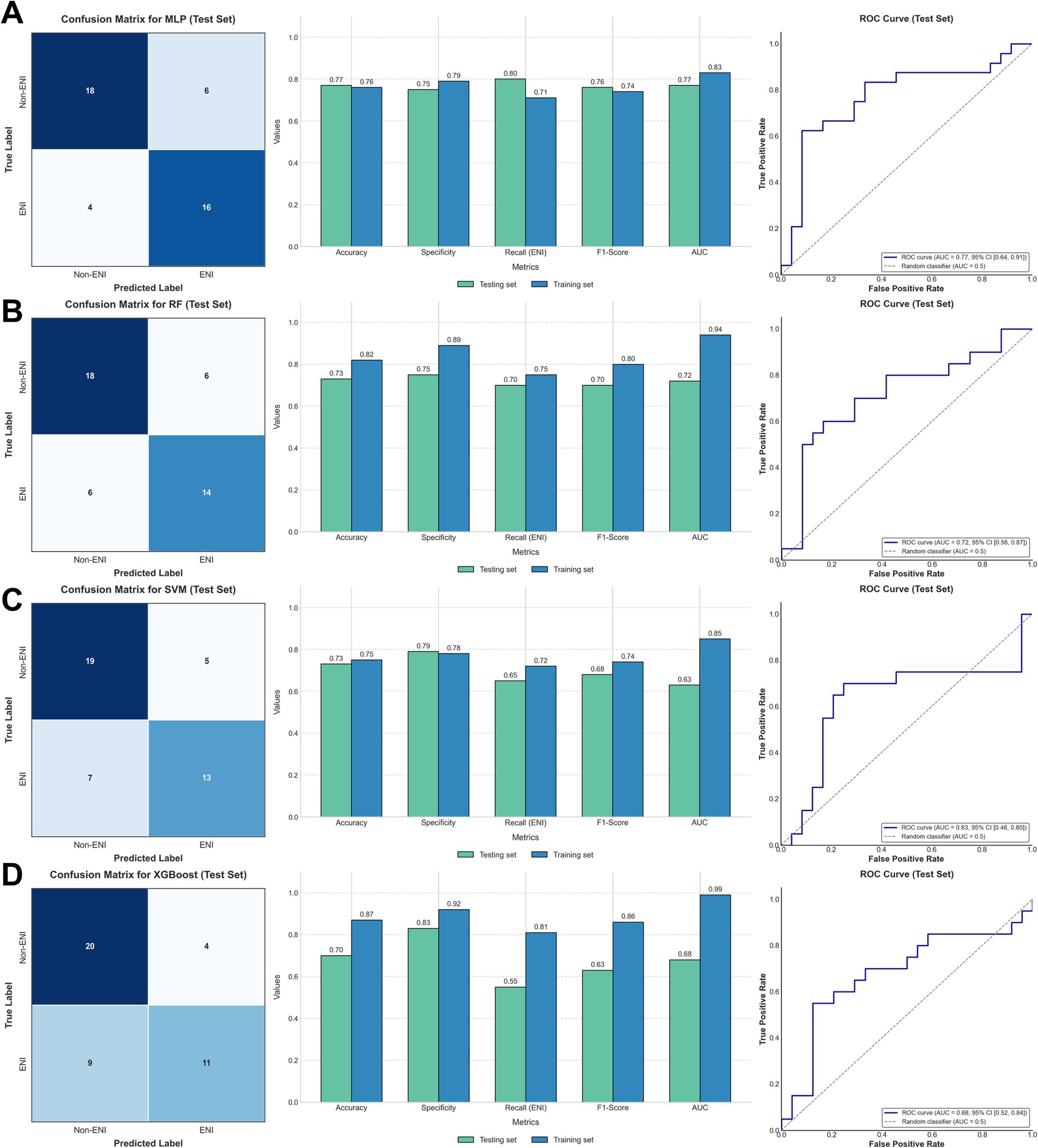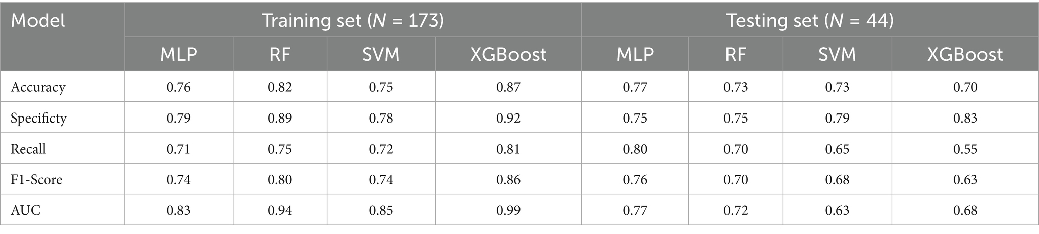 Four ML methods (MLP, RF, SVM, and XGBoost) were used to construct predictive models for ENI using the clinical data. The dataset was divided into training (80%) and testing (20%) sets, comprising 173 and 44 patients, respectively. Using default parameters, all four ML methods demonstrated moderate predictive performance. The AUC values for the training set were 0.83 (MLP), 0.94 (RF), 0.85 (SVM), and 0.99 (XGBoost), while those for the testing set were 0.77 (MLP), 0.72 (RF), 0.63 (SVM), and 0.68 (XGBoost) (Figure 2; Table 2). These results indicate that MLP achieved relatively higher predictive ability compared to the other methods.